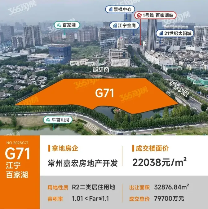这块地去年9月30日出让,当时大战74轮,竞价长达2个多小时,最终被常州嘉宏拿下,地块容积率仅1.1。G71项目位于江宁百家湖片区,距离景枫中心、21世纪太阳城、江宁金鹰直线距离不超过1公里,距离牛首山河直线距离不到200米,未来可打造一线河景住宅。
