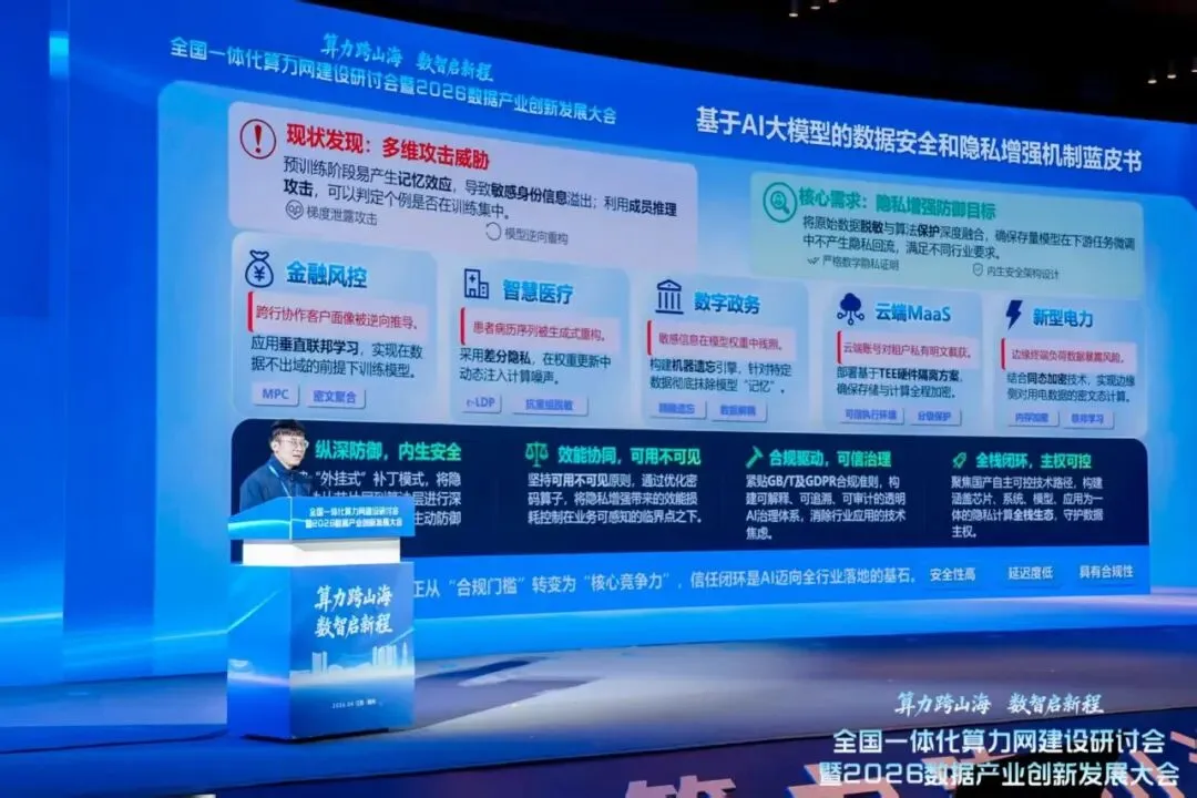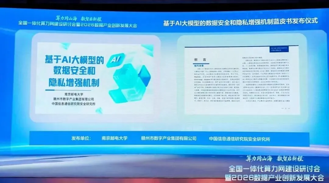 2026年4月2日上午,全国一体化算力网建设研讨会暨2026数据产业创新发展大会主论坛在江西赣州顺利举行。本次大会由国家信息中心指导,赣州市人民政府主办,赣州市行政审批局(市政务服务和数据管理局)、赣州市国投集团(赣州市数字产业集团)、中国电信赣州分公司、重庆西部大数据前沿应用研究院承办,华为、摩尔线程等企业协办,来自国家发改委、国家数据局、各省市数据管理部门、行业领军企业及知名高校约400位嘉宾共同深入研讨算力、数据与人工智能的深度融合路径。会上,南京邮电大学、赣州市数字产业集团有限公司(赣州市数安信息有限公司)、中国信息通信研究院安全研究所联合发布了《基于AI大模型的数据安全和隐私增强机制》蓝皮书,成为本次大会人工智能领域的重磅亮点。蓝皮书由南京邮电大学计算机学院、软件学院、网络空间安全学院副院长黄海平教授代表三方联合发布单位登台发布。