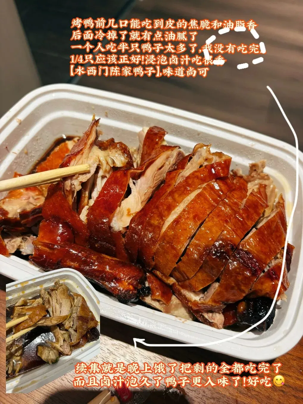 当地人吃烤鸭,一般是斩上四分之一的鸭子便足够了。旅客对份量没有清晰概念,便容易点多,初来乍到的我便点了半只。