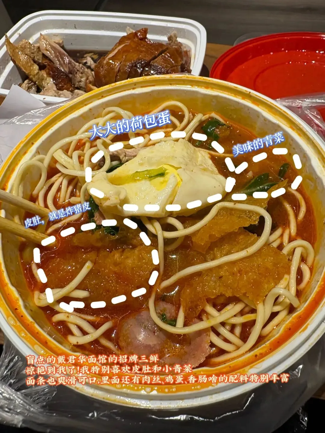 后来出去堂食吃面时,还听到当地人在点单时用方言对店员说:“不要皮肚,面要呛一点。”呛一点,即硬一点:可能咬开时里面还有一点白白的硬芯的那种,本地人的口味是更爱呛一点的面条。