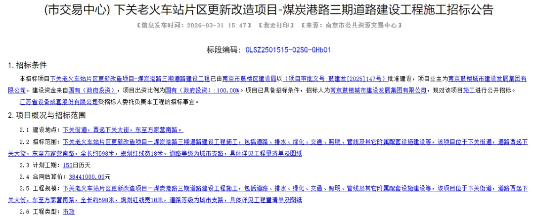 近日,锐评君在市公共资源交易平台发现一则招标公告:下关老火车站片区更新改造项目中的煤炭港路三期道路建设工程,正式启动施工招标。这条全长598米、工期150天的道路建设,并非是普通的市政工程,其中还藏着南京百年老站——南京西站,搬迁工作的关键信号。招标文件显示,下关老火车站片区更新改造项目——煤炭港路三期道路建设工程,已由南京市鼓楼区建设局批准建设,现对该项目施工进行公开招标。