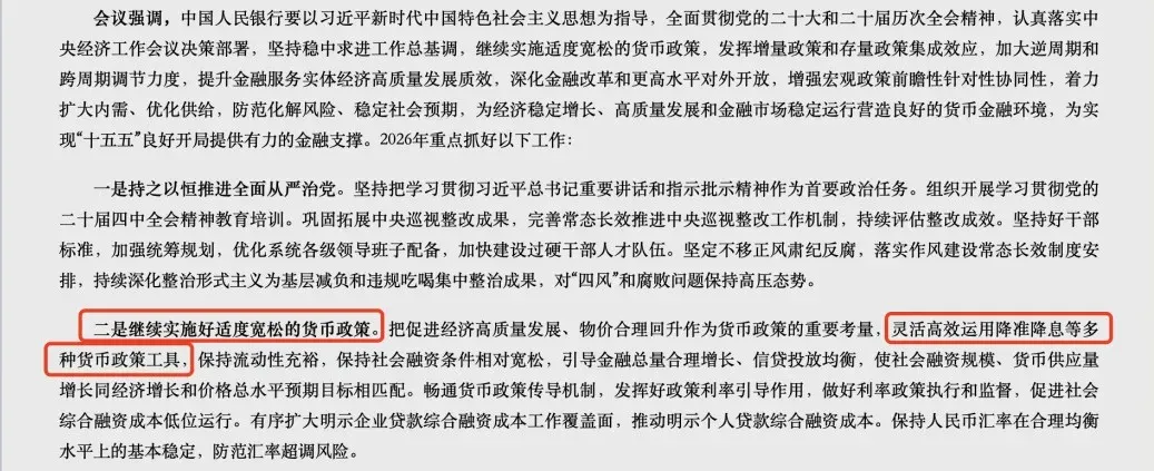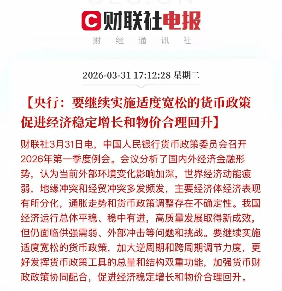 紧接着前天,央行货币政策委员会召开2026年第一季度例会,其中提到:要继续实施适度宽松的货币政策,促进经济稳定增长和物价合理回升。