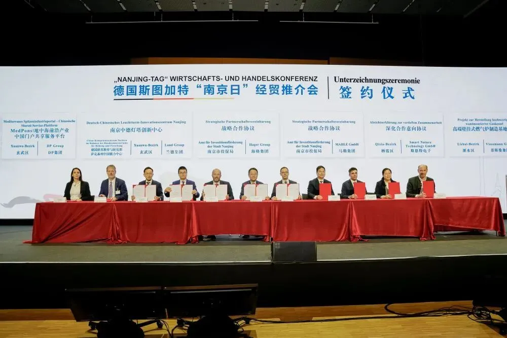 “南京日”现场交流气氛热烈,合作成果丰硕。参会企业与德国联邦中小企业联合会等德国重要商协会签订合作协议,畅通中德经济交流“微循环”;与全球汽车零部件百强企业马勒集团中国区商定,围绕新能源领域开展研发合作;与德国相关机构、企业签约,在南京落地中德灯塔创新中心等项目。