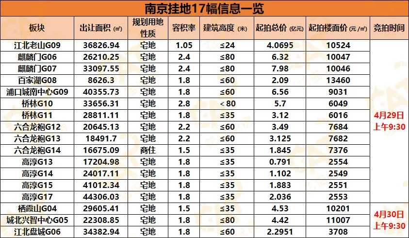 这两天(3.31-4.1),南京连发5条挂地公告,涉及江北老山、江宁百家湖、城东麒麟等多个板块,累计挂出17幅涉宅地块。地块将分两批次出让,分别于4月29日、4月30日上午9:30开拍,具体详情如下: