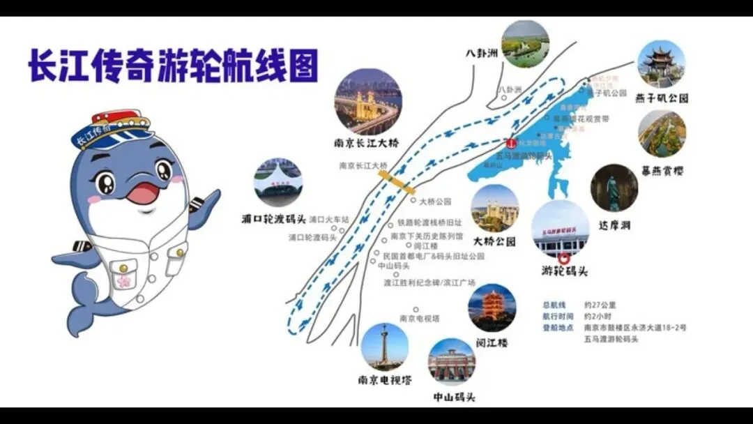路线:五马渡码头 → 幕燕滨江 → 燕子矶 → 长江二桥 → 八卦洲 → 浦口火车站 → 南京长江大桥 → 中山码头 → 阅江楼 → 返回五马渡