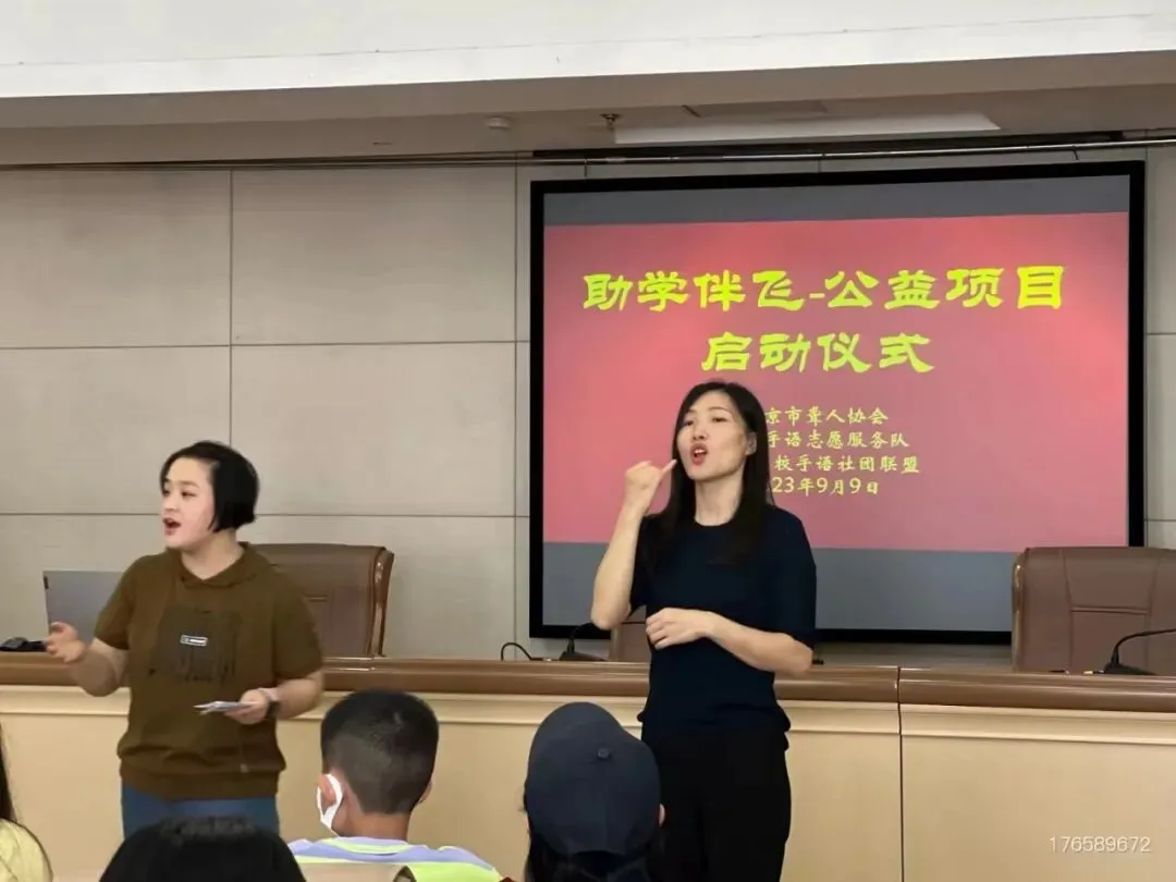 2023年,南京手语志愿服务队启动“助学伴飞”公益项目,我积极参与第一、二期的组织工作,现场协调聋听融合及志愿者分工,展现了调度与控场能力。