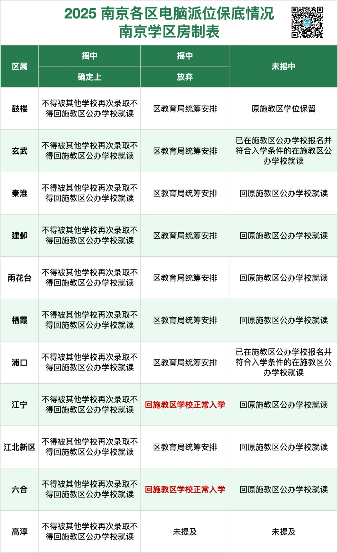 最近咨询幼升小、小升初摇号的家长越来越多,今天就帮大家把 摇号升学全流程 梳理清楚,一篇看懂、少走弯路。我们常说的摇号计划与派位计划是同一概念,二者完全等同。报名学区校与参与摇号互不冲突,务必先报名学区校 —— 摇号存在不中概率,学区校是保底保障。部分家长误以为摇号填报时需选公办校保底,这是错误认知。摇号的 “保底校” 特指 学区校 ,若摇号未中,将自动回学区校就读,这才是保底;而摇号阶段选填的学校,不存在保底机制。若被2所中学同时派中 ,须在规定时间内明确选择其中1所; 逾期未确认,视为自动放弃。⚠️ 重要提醒:电脑派位派中且 现场确认后又放弃 的, 原施教区学位不再保留 ,统一由区教育局统筹安排学校(江宁、六合区除外)。按以往政策, 幼升小与小升初摇号规则不同 ,具体如下:- ✅ 幼升小可报名2所学校 ,组合不限:2所公办、2所民办,或1公1民均可。