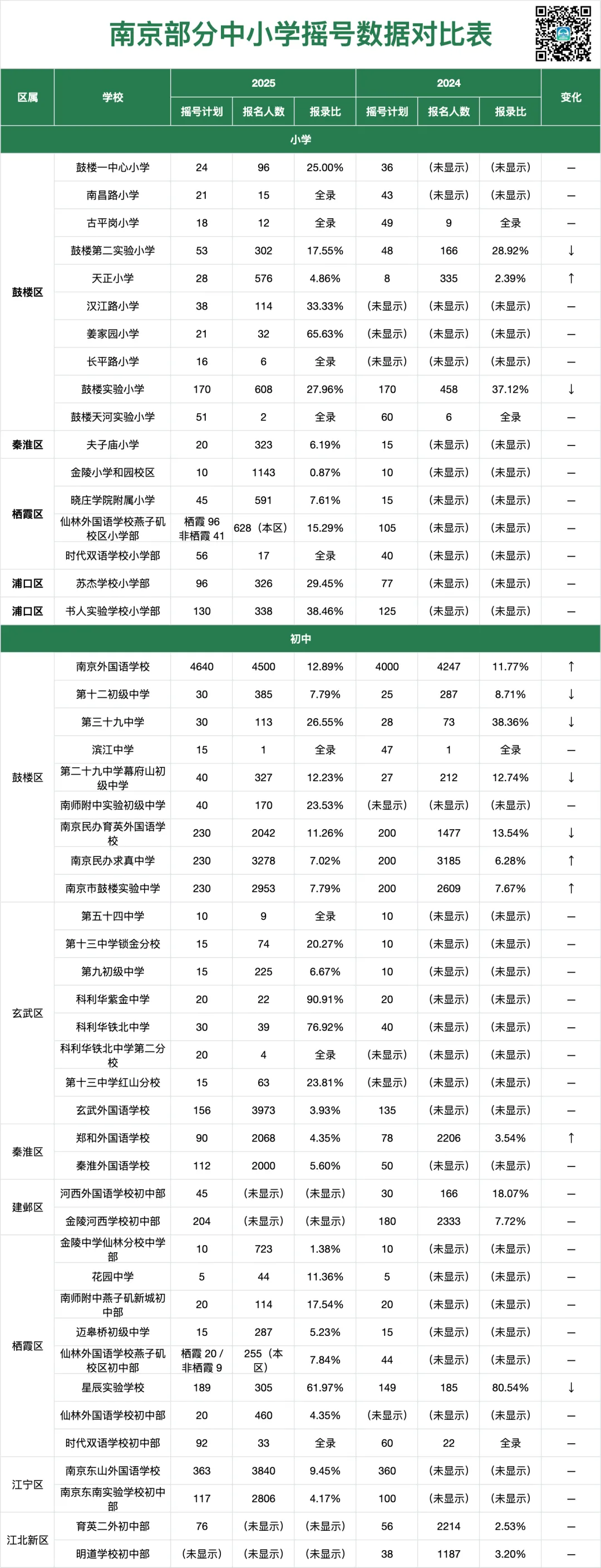 不少家长填报志愿时会误填自家学区校 ,这是白白浪费1个珍贵摇号名额 !学区校本身就是保底, 填了也无效、完全没必要填 ,切勿浪费宝贵志愿!通常, 有摇号计划的学校多为热门公办校(空余学位)和民办校 ,二者是摇号的主要对象,2025各区摇号计划,供大家参考。参加摇号务必先看招生范围 ,并非所有学校都能随意报名。以鼓楼区为例:公办小学、公办初中严格限本区户籍,外区户籍一律不能报;即便户籍在鼓楼,若未先完成学区校报名、不满足本区入学基本条件,也无法参与该区公办校摇号。核心原则 :报名有户籍 / 区域限制的摇号学校,前提是必须先满足该区域的入学资格条件 。没有户籍限制的,只有面向全市招生的学校,报名前一定要看清楚!民办校大多面向全市招生,但并非全部!例如江宁区就有不少民办校仅面向本区招生,家长务必仔细核对招生范围,切勿浪费仅有的 2 个摇号名额。2025 年阳光招生平台正式启用后,部分升学通道收紧,不少学生只能通过摇号入学。今年家长已有前车之鉴,应对会更加从容。我们预判, 今年摇号热度或将明显降温 ,核心原因主要有三点:- 一是供需对冲,摇中概率反而提升 。去年虽因政策收紧,不少家庭只能转向摇号碰运气,但同步增加的摇号名额形成了有效对冲,整体报录比并未被推高;像求真、鼓实这类热门校,报录比甚至有所回落,摇中机会反而更大。