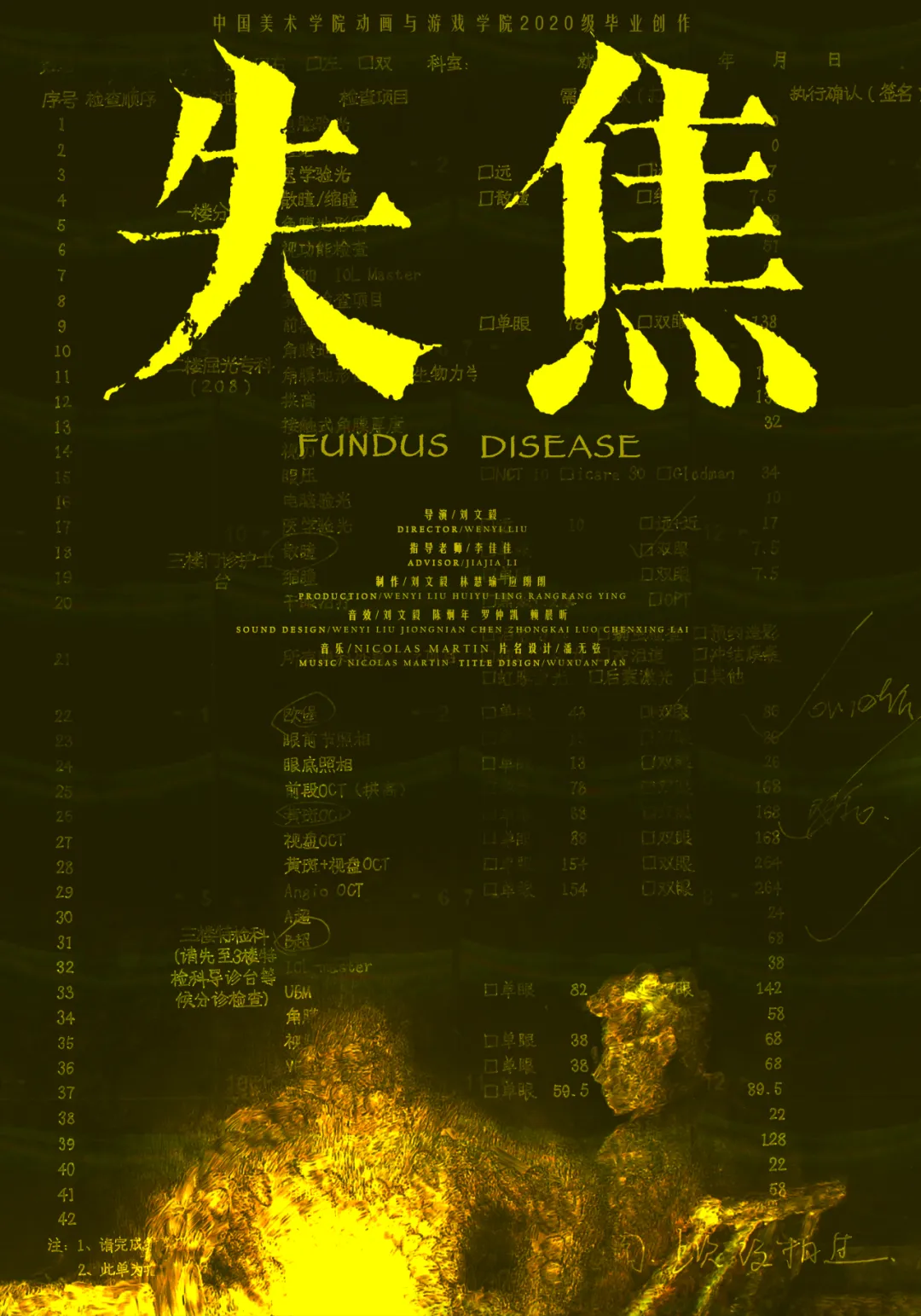 《失焦》动画使用 paint on glass 技术进行绘制,充满不确定性的画面意图再现一位眼疾患者的记忆世界。同时使用医学影像、同期声录音,实现个人记忆的展演。