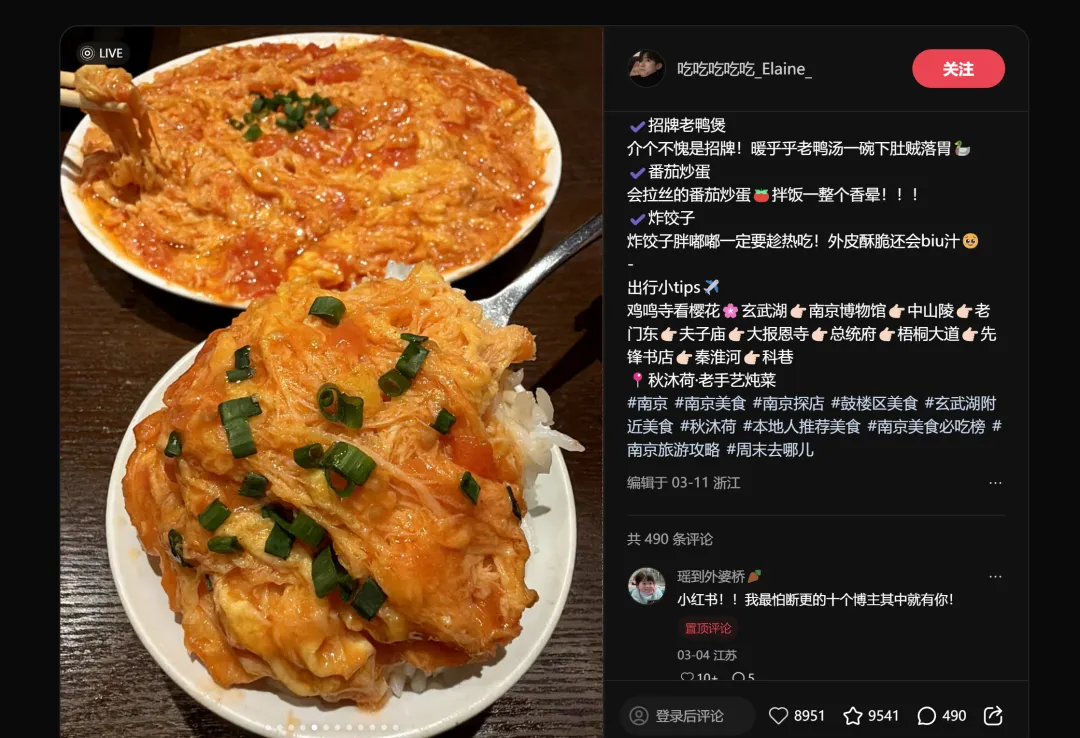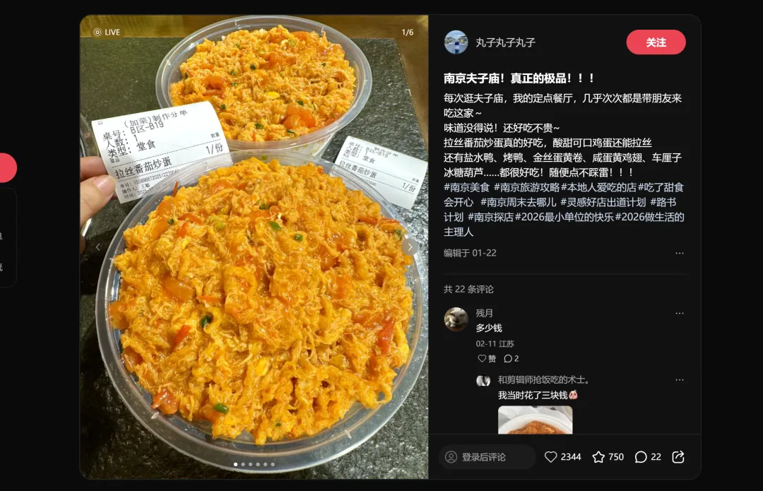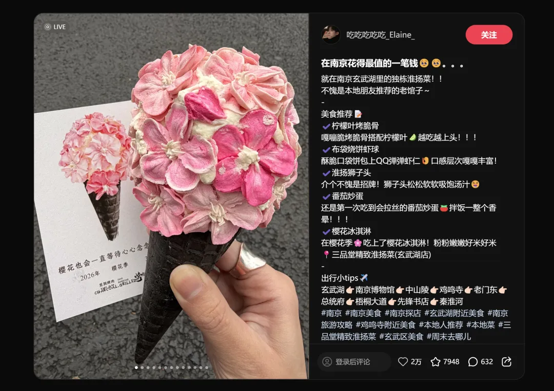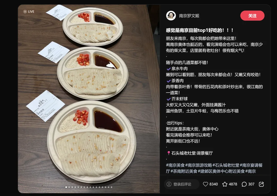 第二名和第三名的标题几乎一模一样——"感觉是南京目前top好吃的",分别拿下8951赞和8340赞。这不是巧合,而是说明"城市TOP1"这个定位本身就自带传播力。消费者不怕你吹,怕你吹得不够具体。"南京最好吃"比"很好吃"有效十倍。