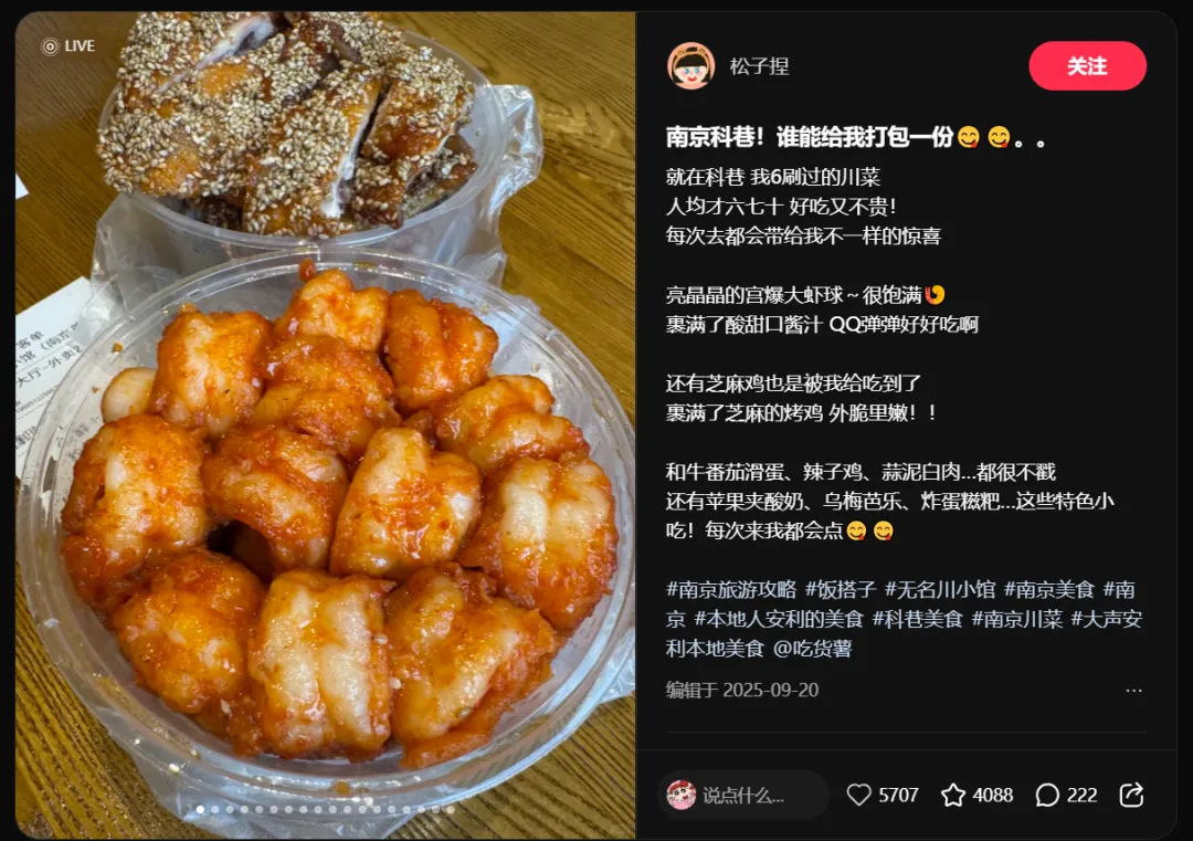 再看科巷那条——"谁能给我打包一份",5707赞。科巷作为南京老牌美食街,本身自带流量标签,但能跑出高赞,靠的是场景化表达:不是"推荐你去吃",而是"我好想再吃一口"。这种"馋"的情绪传染力远大于理性推荐。