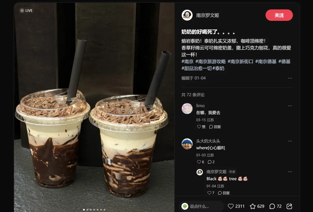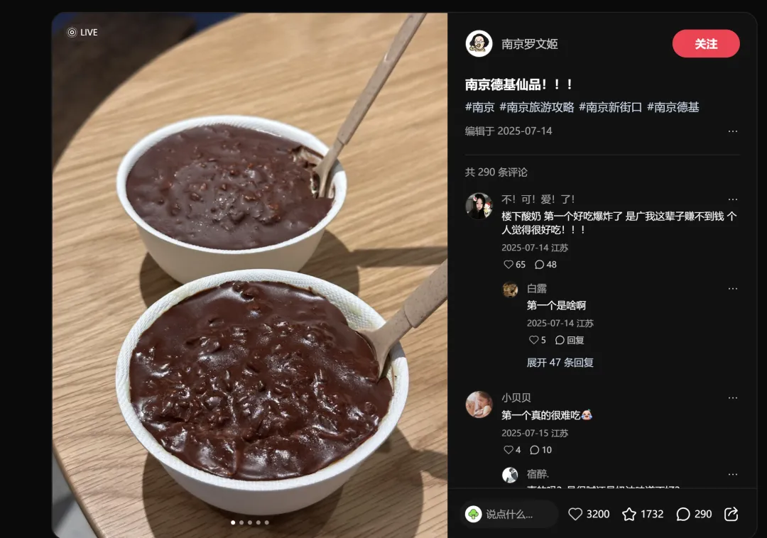 趋势洞察: 德基广场作为南京顶级商场,其甜品爆品的出现说明"高端商场+网红甜品"的组合仍然是年轻消费者打卡的核心场景。选址在高势能商圈,产品本身就自带内容属性。