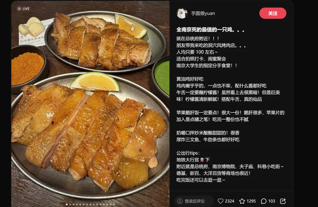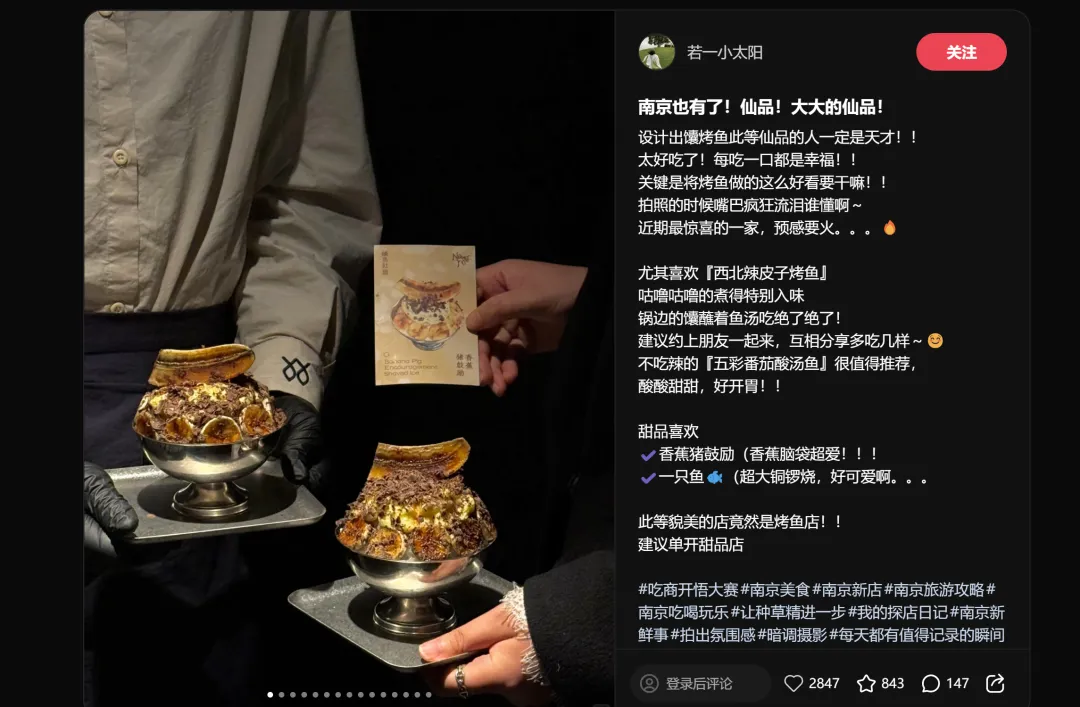 排名第一的爆品,一条笔记拿下30000赞——"在南京花得最值的一笔钱",这个标题本身就是教科书级别的种草文案。没有堆砌食材,没有强调装修,一句"花得最值"直接打中消费者的决策核心:性价比+体验感。