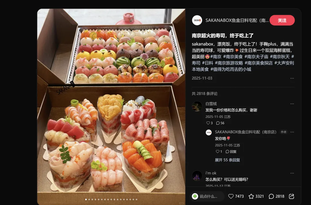 异域料理方面, 一家寿司店拿下7473赞,"南京超火的寿司,终于吃上了"——"终于"二字暴露了关键信息:这家店已经形成了排队效应和稀缺感知。 当消费者觉得"吃到就是赚到"的时候,传播就是自发的。