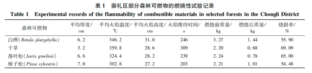 崇礼区的植被具有种类多、覆盖广的特点,因此在室外点火试验前,本研究对该地区一些常见的森林可燃物进行火行为分析(图2a),试验测得4种森林可燃物(白桦、干草、落叶松、樟子松)的燃烧性数据如表1所示。其中,干草的烧损率最高为69.09%,其次为落叶松65.00%,最低为樟子松54.48%。室外点火试验的可燃物使用白桦树枝,并且使用干草、落叶对其助燃。
