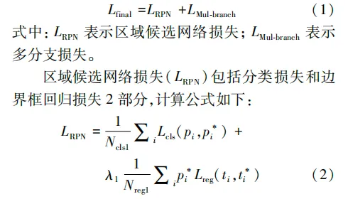 式中:N*表示锚框的个数; λ1表示锚框调整所造成的损失; Lcls示分类损失; Lreg表示边界框回归损失; pi表示第i个锚框输出结果为正类的概率; ti表示第i个锚框的回归参数。