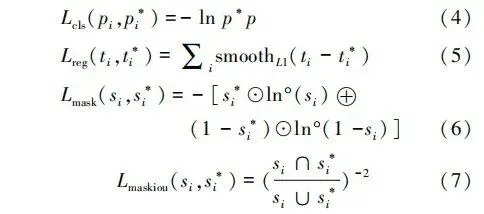 回归损失Lreg、掩膜损失Lmask、分类损失Lcls和掩膜交并比损失Lmaskiou计算公式如下: