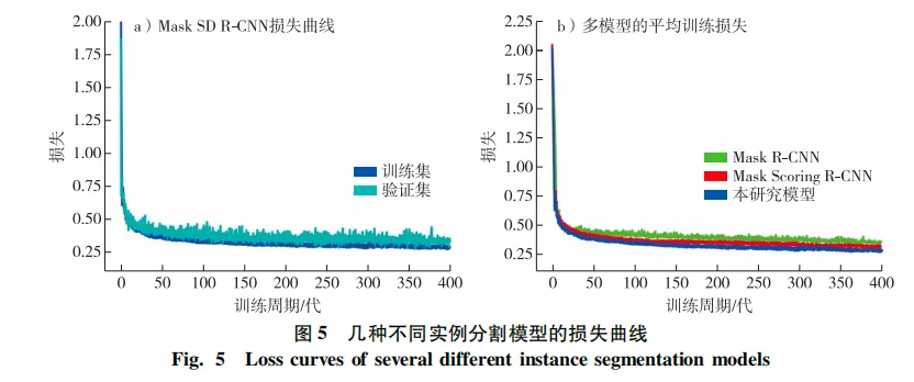 本试验是在基于Tensorflow和Keras的深度学习开发环境下进行的,采用GTX1080Ti GPU和Adam算法对Mask SD R-CNN进行训练。整个周期的平均训练损失和每个周期结束后的验证损失,两者都逐渐趋于收敛(图5a)。为了更好地验证本研究模型的性能,将Mask SD R-CNN与其他两个模型性能进行量化比较。根据图5b分析,在训练阶段,Mask SD R-CNN的整体训练损失低于其他2个模型。Mask Scoring R-CNN通过增加掩膜交并比分支从而提升了掩膜的质量,并且减少了训练损失。而本研究提出的Mask SD R-CNN利用DeepLabv3+对MaskIoU分支进行优化,结合了网络中的浅层特征与深层特征,从整体上提高了分割模型的性能。