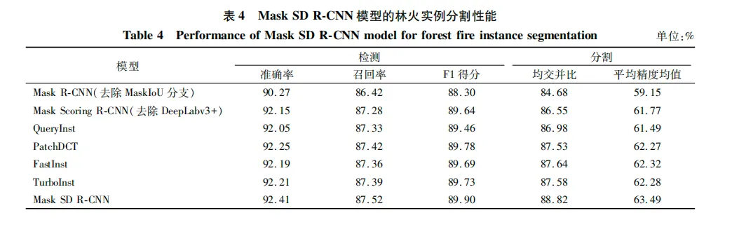 模型具体的测试结果和对比数据见表4。通过与近期的方法QueryInst、PatchDCT、FastInst、TurboInst对比发现,相较于性能最好的TurboInst,本研究模型在检测精度(准确率、召回率、F1分数)上分别提升了0.20,0.13和0.17个百分点; 在分割精度(mIoU、mAP)上分别提升了1.24和1.21个百分点。这进一步证实了利用DeepLabv3+对MaskIoU分支重构后的网络在林火分割上是十分有效的。