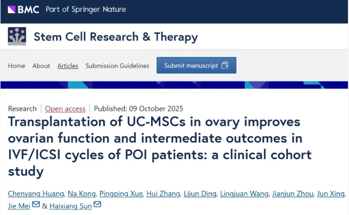 近日,南京鼓楼医院生殖医学中心在国际权威期刊《Stem Cell Research & Therapy》上发表了一项重要研究成果。该研究首次通过严谨的临床队列研究证实,脐带间充质干细胞(UC-MSC)卵巢内移植能够显著改善POI患者的卵巢功能和体外受精(IVF)结局。