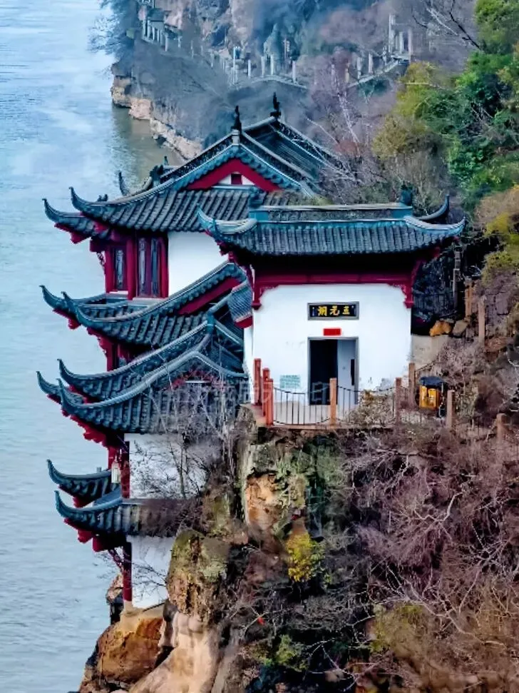 是个在悬崖里的溶洞,就在江边。洞不大,但凉快——夏天外面三十多度,洞里跟开了空调似的。里面供着天官、地官、水官,说是能保佑人“连中三元” 。考研考公的朋友可以进去拜拜,万一灵了呢?