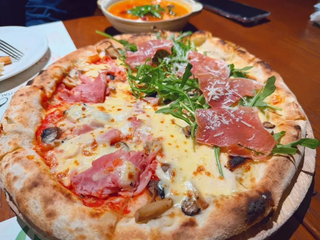作为这顿主角的3.0披萨 其实是芝麻叶生火腿和黑松露菌菇火腿的双拼,一次可以品尝2种味道,完美解决选择困难症的难处。刚出窑炉的饼皮,端上桌时奶酪芝士还滋滋作响,扑面而来的香气未尝就让人垂涎三尺