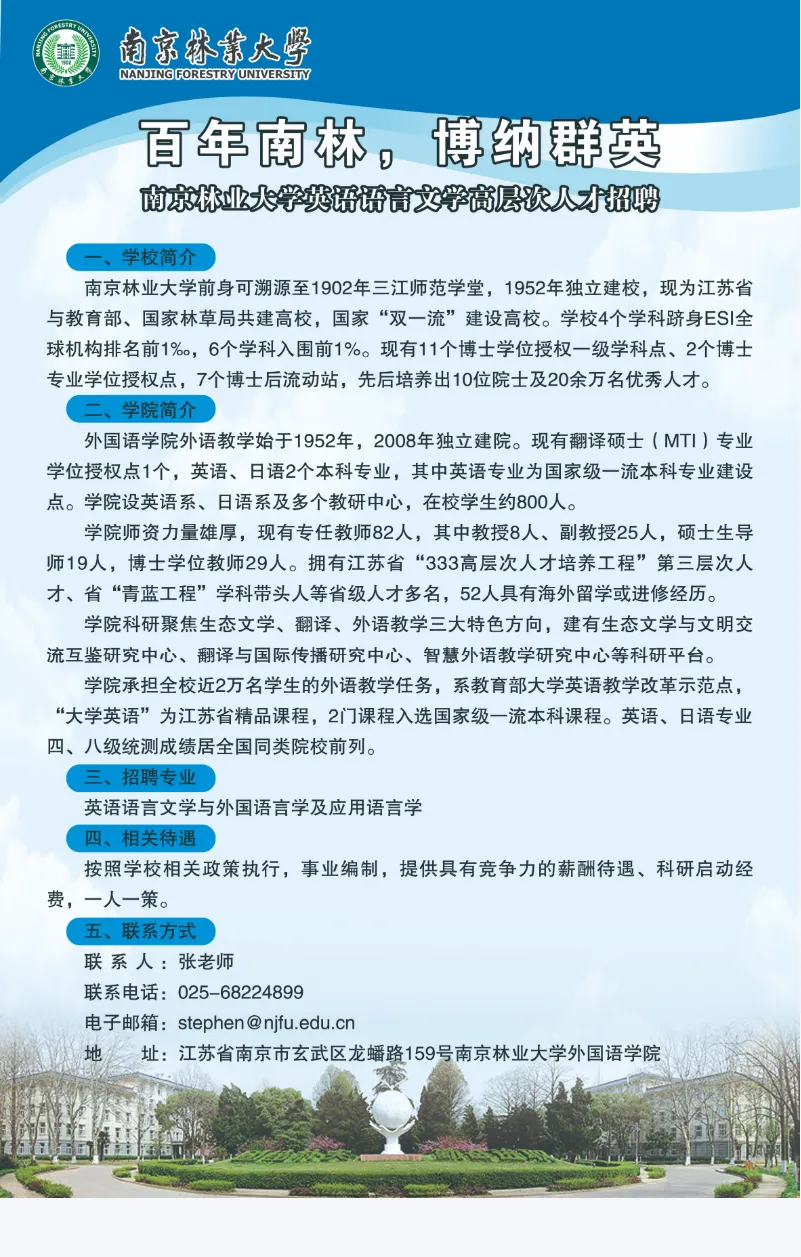 南京高层次人才招聘 | 南京林业大学英语语言文学高层次人才招聘