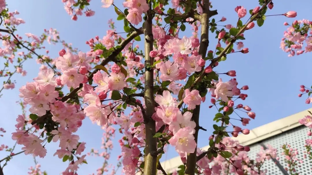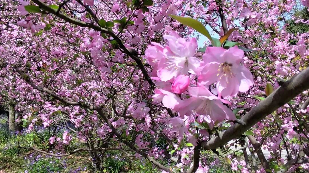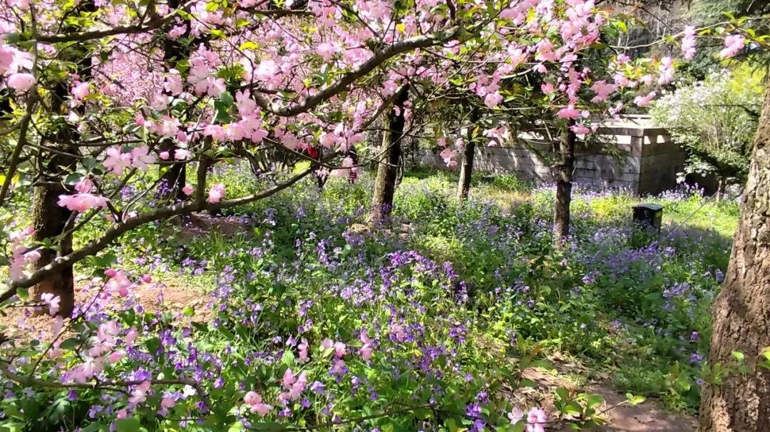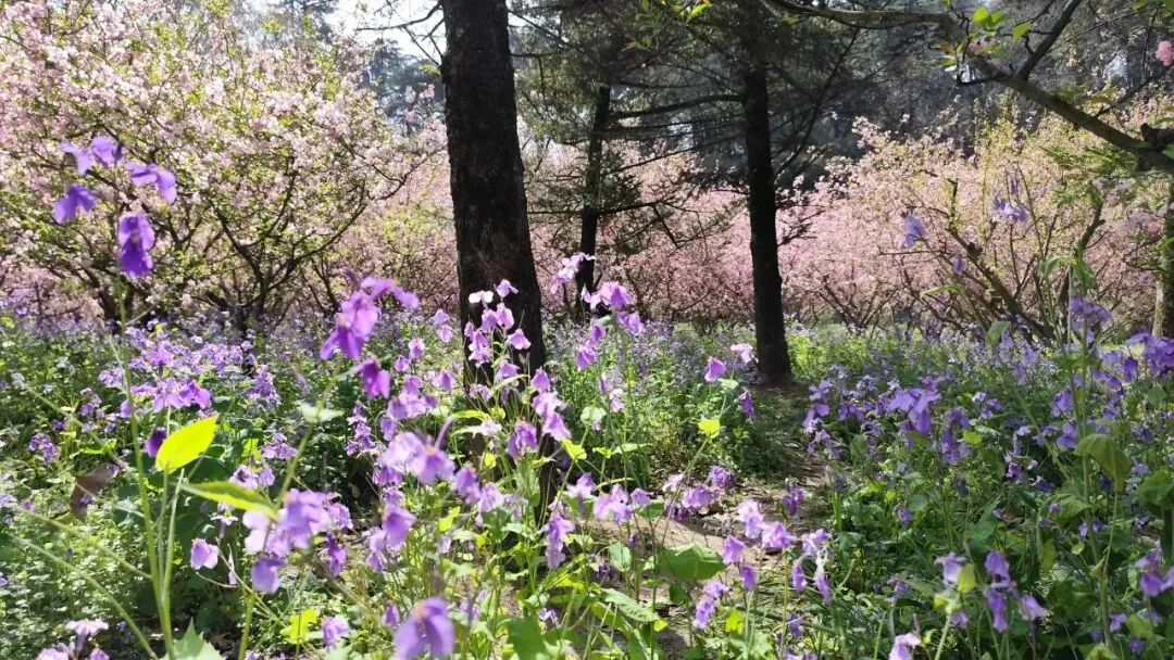 识图说是西府海棠,“花开满枝、色泽胭脂”。而低处则是二月兰,耐寒耐阴,特别适合在林下、林缘成片生长。两花一粉一紫,一高一低,格外迷人。许多游客在此驻足拍照。