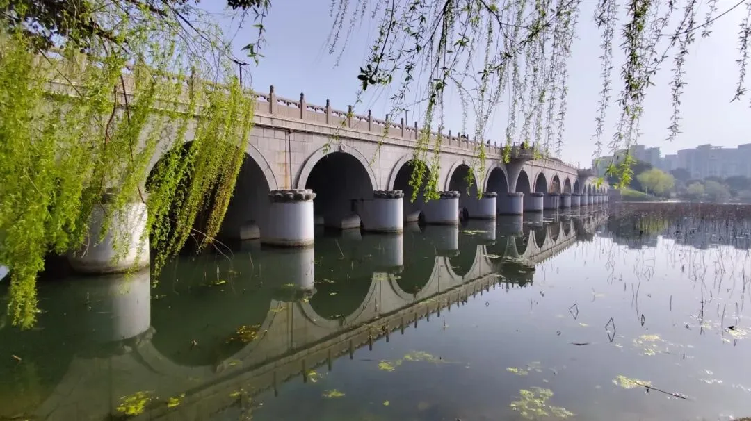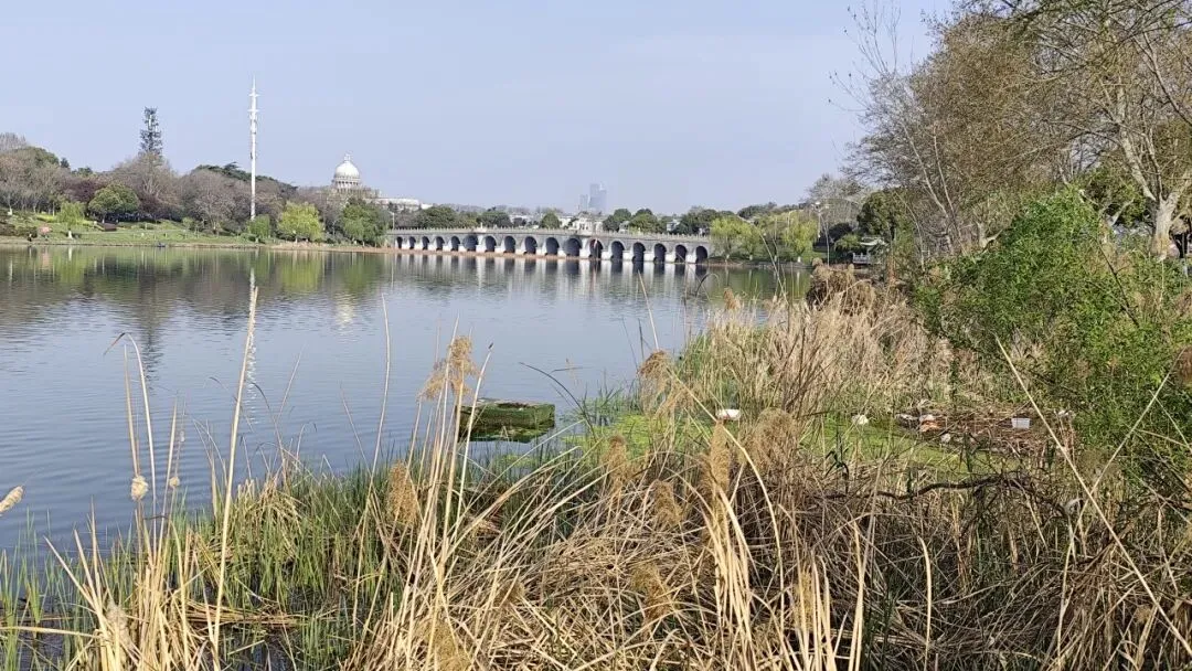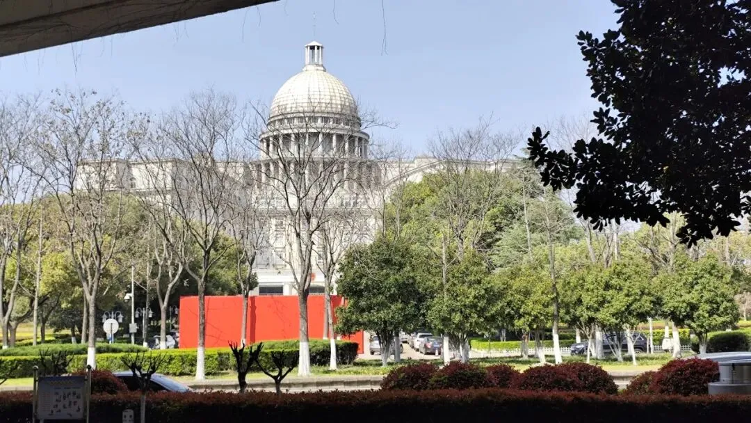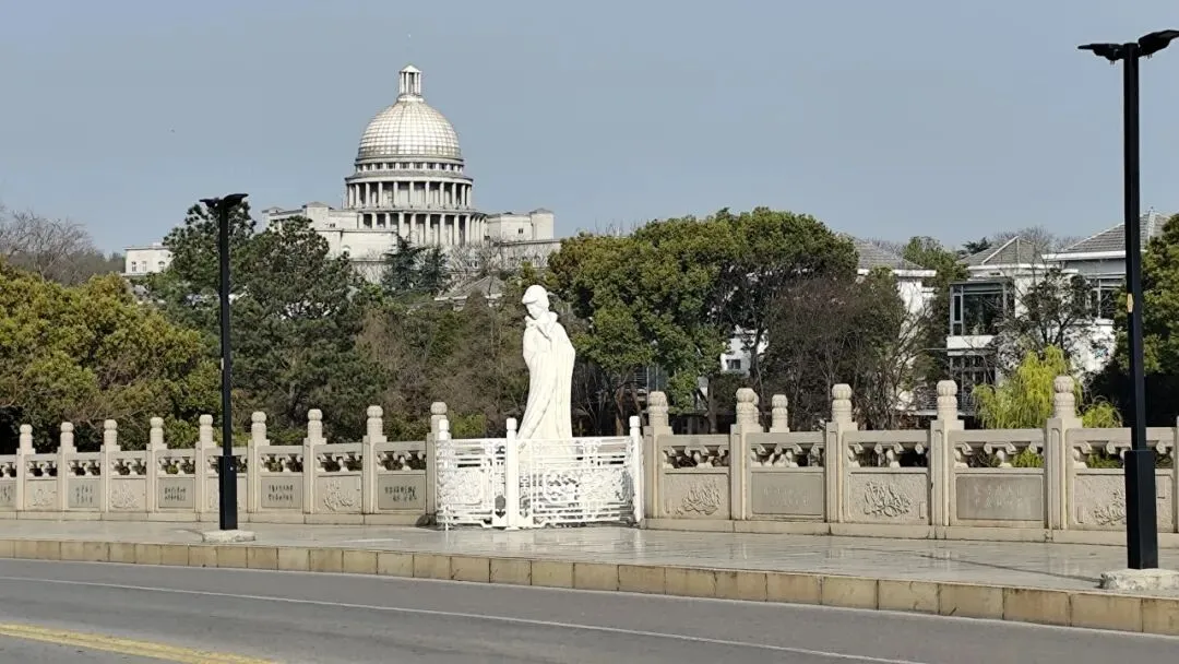 走到花神渡桥上,远处是雨花台区政府大楼。据说当年区领导希望建筑 “有气派、标志性强”,最终选定仿美国国会大厦方案,采用新古典主义风格,白色为主,顶部高耸圆顶,东西两层柱廊,南北单层环廊,网上褒贬不一。