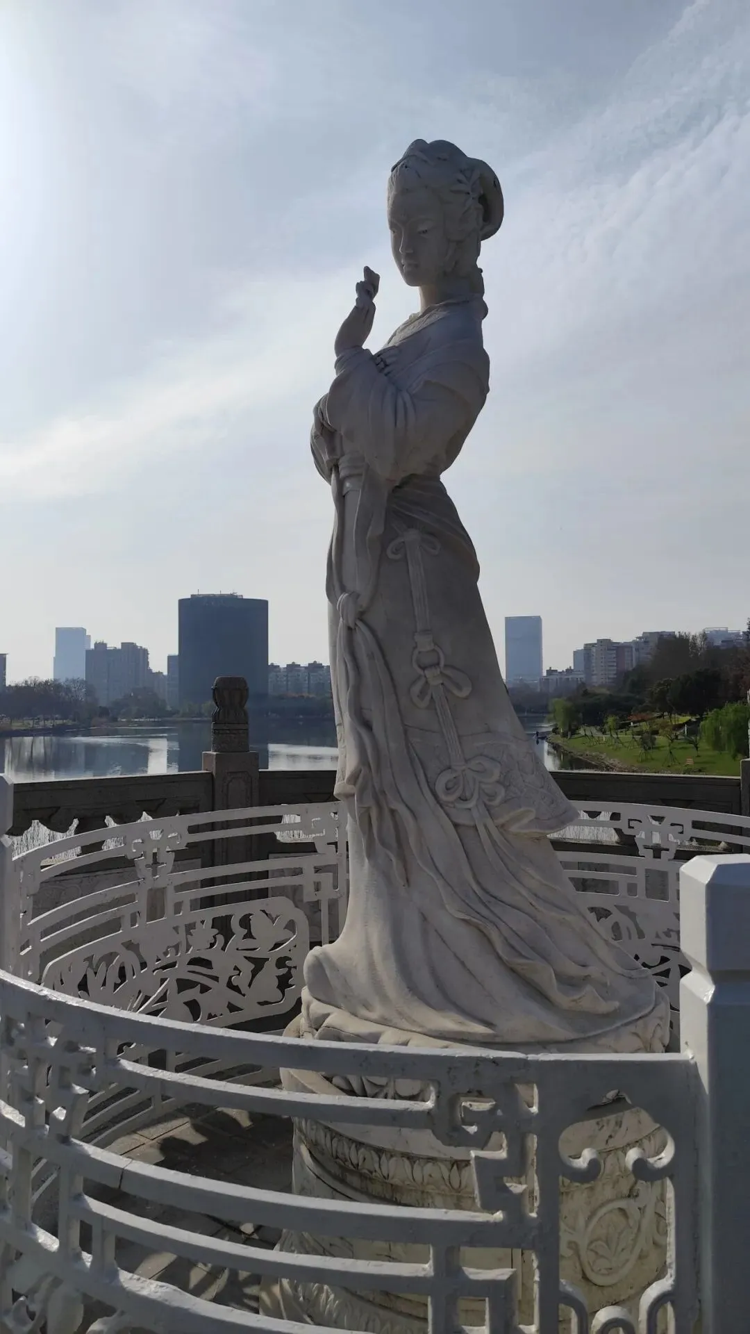 花神渡桥是17孔仿古石拱桥,桥上对称矗立4 尊汉白玉花神像,代表四季名花,代表春季的兰花神马守真(明代才女画家),代表夏季的海棠神:孙道绚(宋代女词人),代表秋季的牡丹神杨玉环(唐代贵妃),代表冬季的梅花神江采萍(唐玄宗梅妃)。大桥上也有许多人在钓鱼,还有些把鱼竿放在雕像上,不是很好拍照。再往前到步道入口。