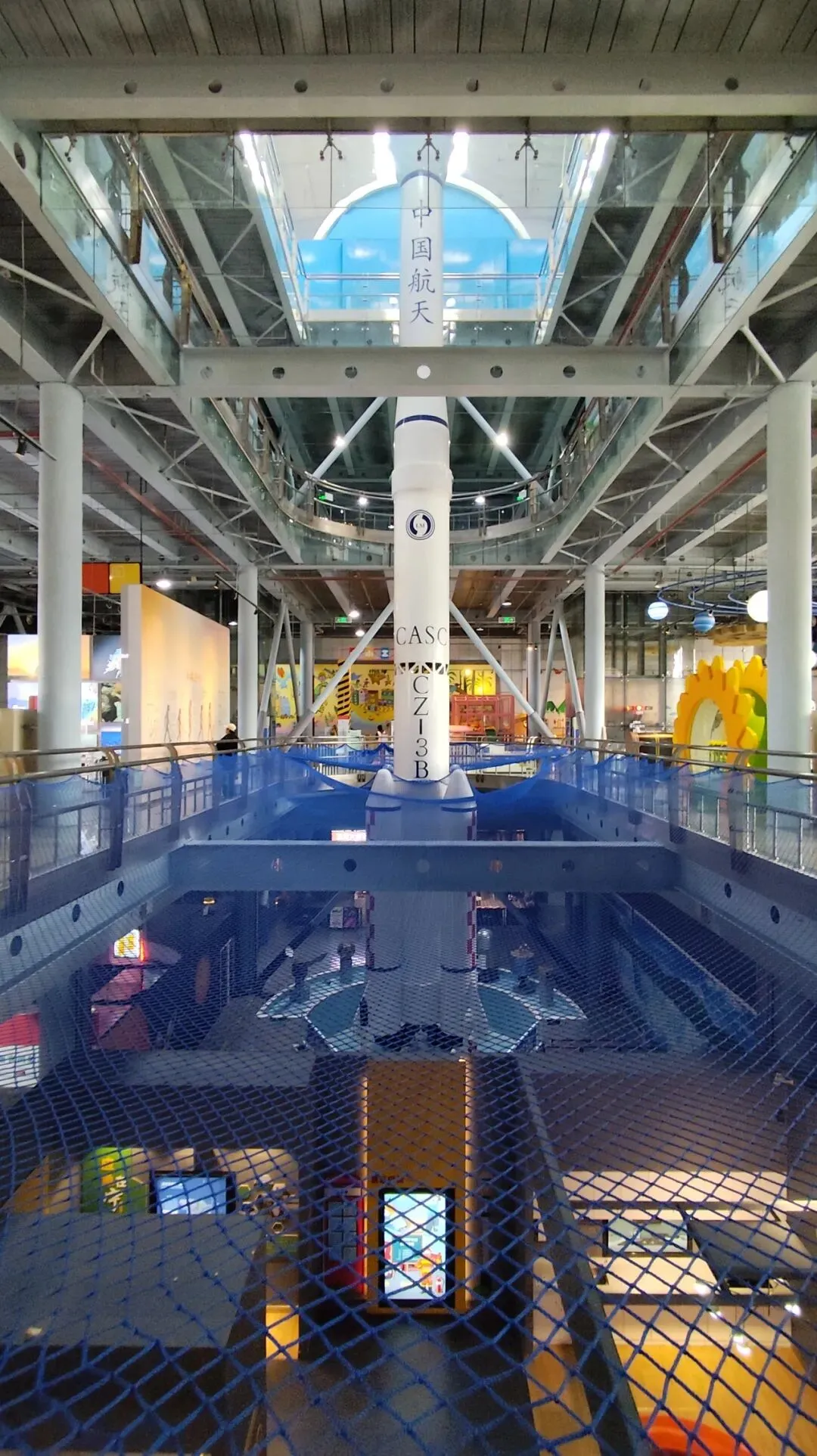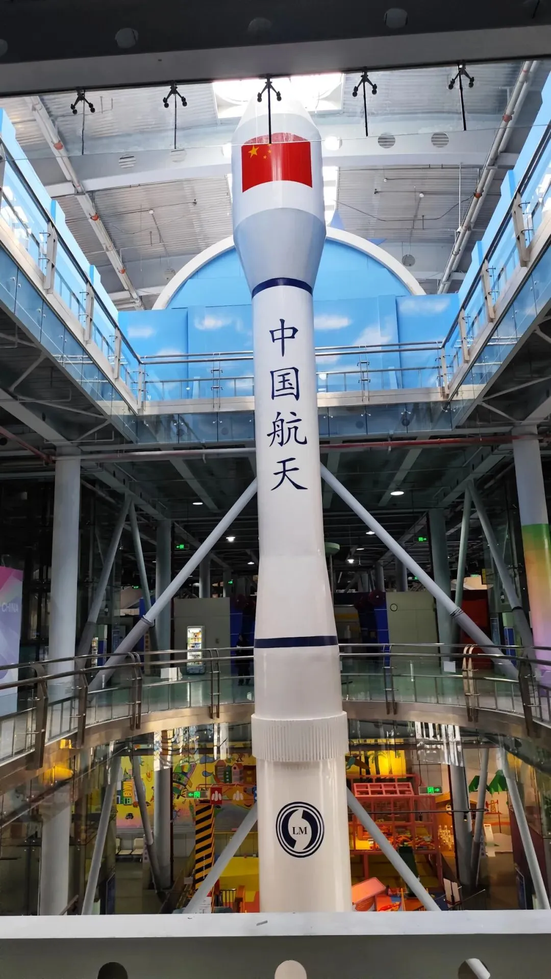 大厅中央的火箭模型横跨四层楼,非常壮观。