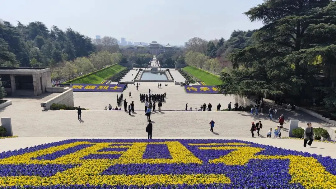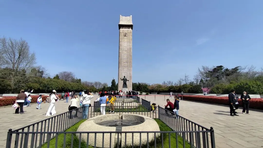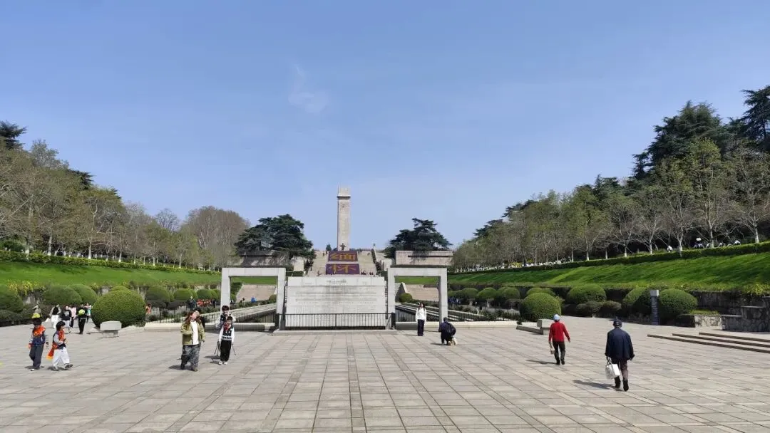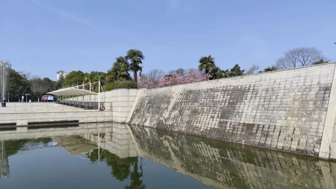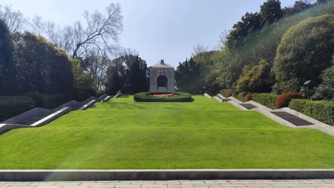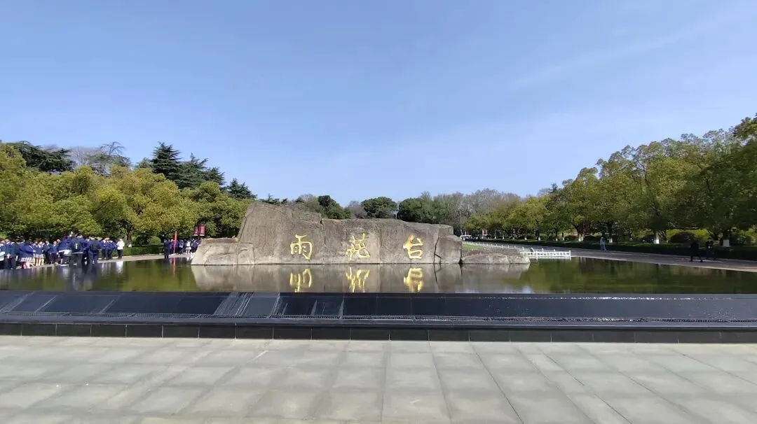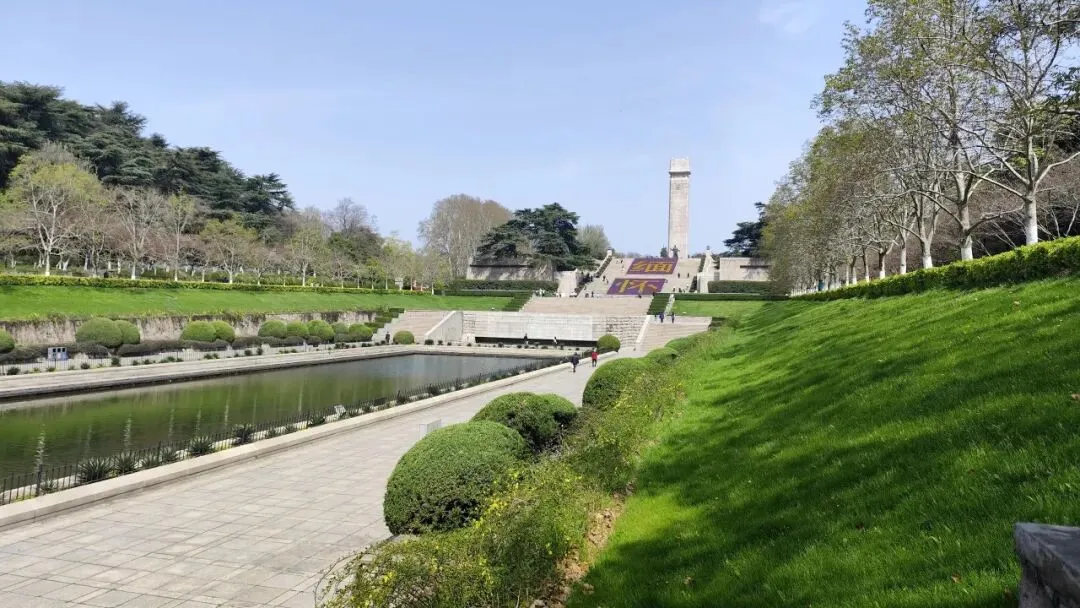 再往前是雨花台倒影池,呈长方形,水面平静如镜,依山就势、利用光学折光原理,将纪念碑、纪念馆的庄严身影完整倒映水中,形成 “天地同辉、虚实相映” 的肃穆景观。