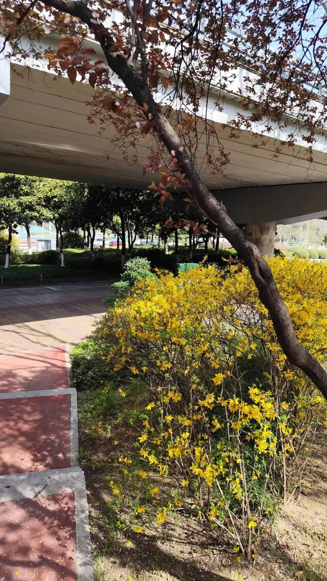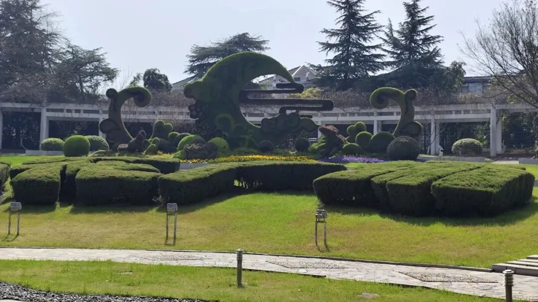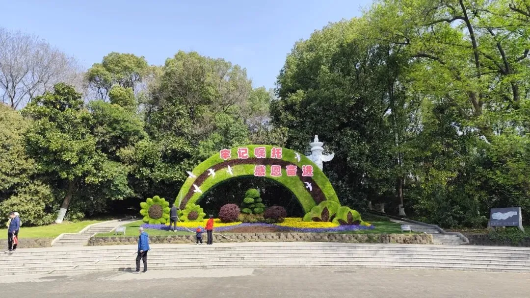 雨花广场在高架桥下,还有一些人在唱歌、演奏乐器。中央是新月形的灌木绿雕。过马路就到南门广场,外边是个环岛,入口处停着许多大巴,是学校在组织春游。