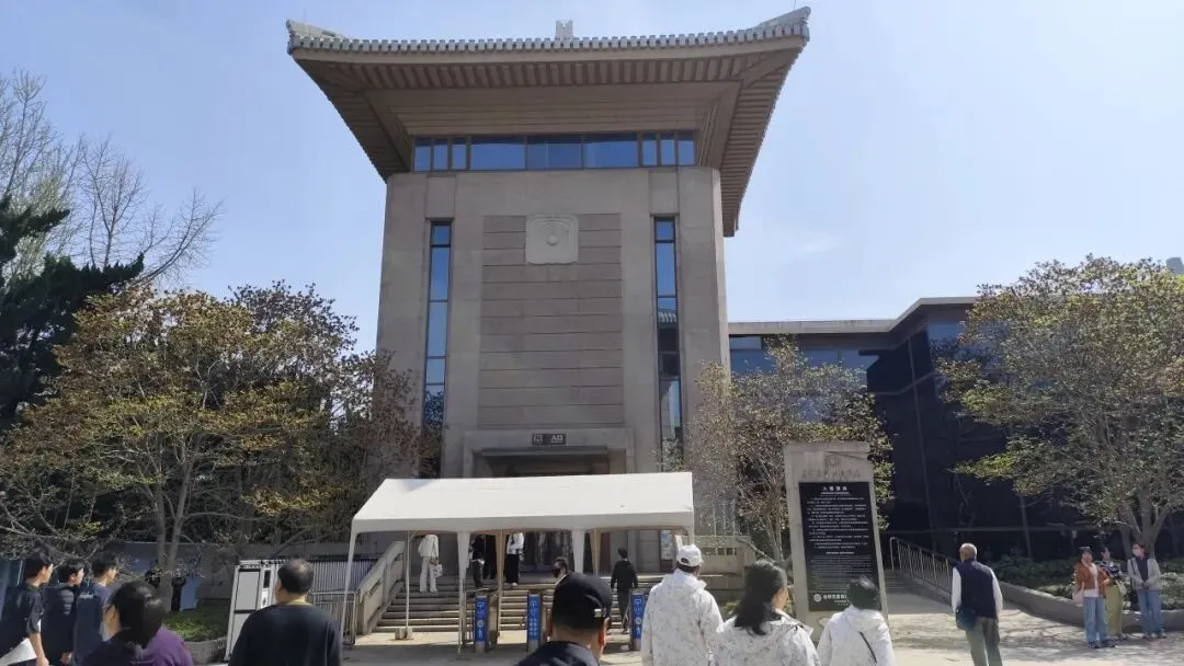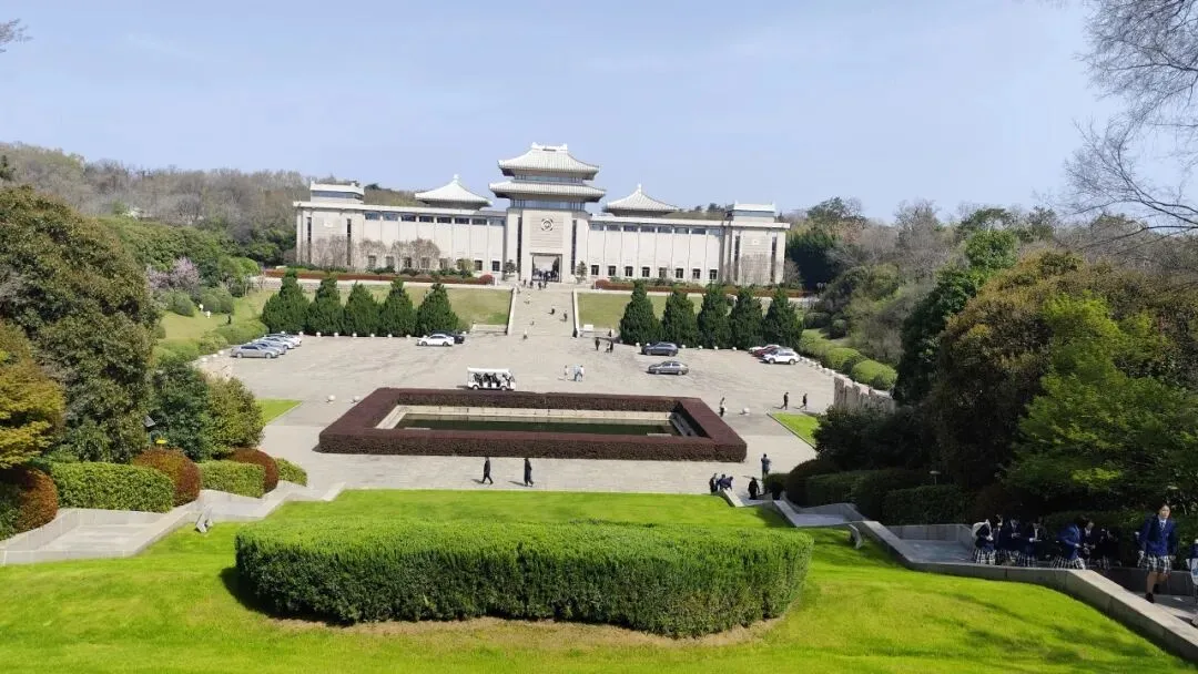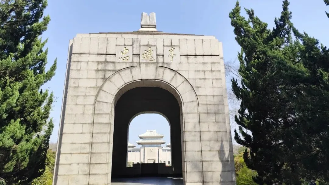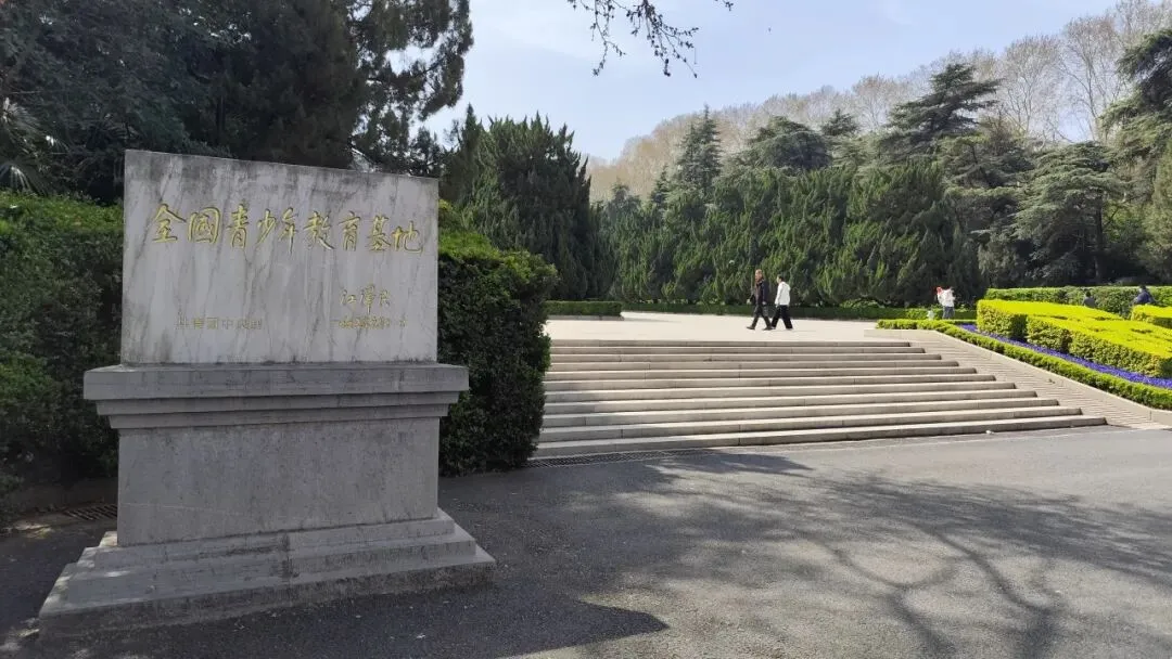 再往前是雨花台烈士纪念馆,是国家一级博物馆,1988年7月1日正式对外开放,整体为两层白色古典风格,平面呈凹字形,东西长92米、南北宽49米,主堡高26米,建筑面积约5900平方米,通体以白色花岗岩与乳白色琉璃瓦打造,庄重素雅,与周边苍松翠柏相映生辉,门额上方是邓小平同志亲笔题写的馆名,檐下正中设有“日月同辉”花岗岩馆徽,象征英烈精神与日月同辉。