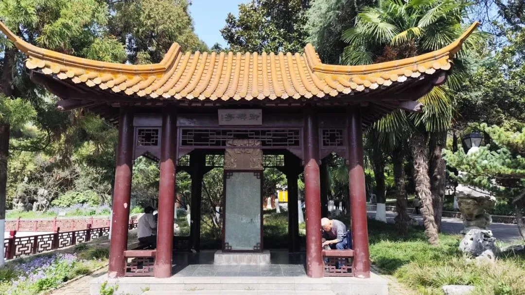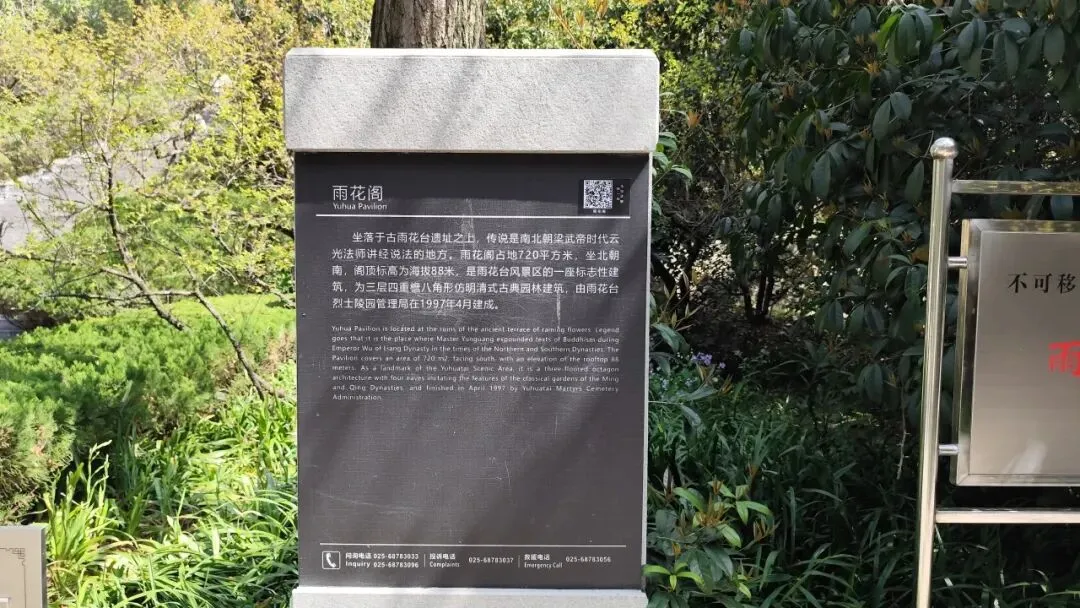 再往南走有乾隆御碑亭,为保护清代乾隆皇帝御题诗碑而建的仿古亭阁携程。御碑为清乾隆年间(1751—1765)弘历三游雨花台时所立。