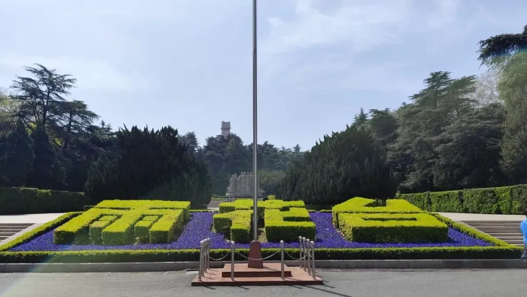 广场地面开阔平整,以规整的铺装与绿化相结合,周边环绕着茂密的松柏与花卉,前方设有宽敞的集散空间与花坛景观,整体视野通透、氛围庄重宁静。