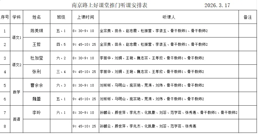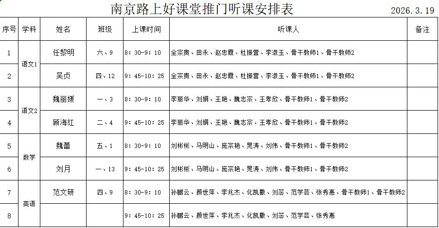 为抓实课堂教学主阵地,深化学校常态课学科建模研究,切实提高课堂教学效率,全面提升学生核心素养,3月17日起,开展为期两周的“南京路上真课堂”常态课推门听课活动。本次活动坚持"随机进班,随堂听课,精准评课"原则,由校长牵头,教干、教研员、教研组长及骨干教师组成专业听评课团队,深入一线课堂把脉教学实况,以听促教,以评促研,以研提质,推动学校教育教学质量稳步提升。