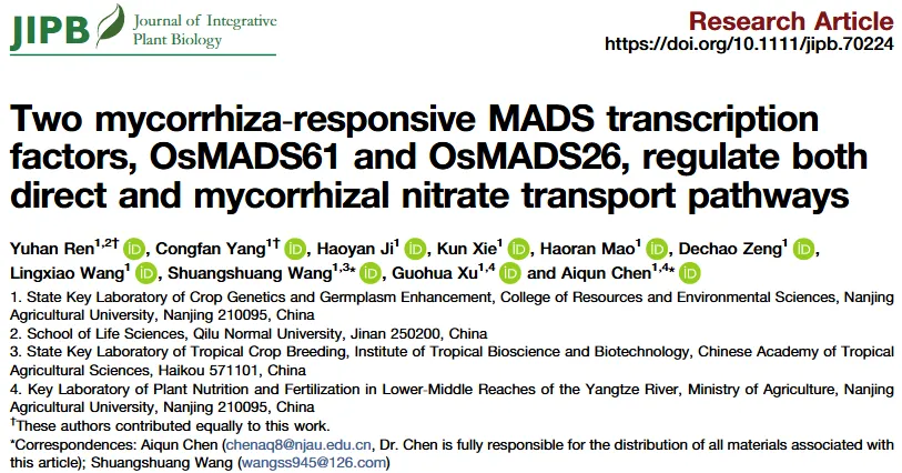 氮素是作物生长发育必需的大量元素,硝酸盐是旱地与水稻田有氧环境中植物主要吸收的氮素形态。超过 70% 的陆地植物可与丛枝菌根(AM)真菌形成互惠共生体系,构建根系直接吸收与菌根共生途径两套氮素获取系统。前期研究已鉴定水稻 AM 特异性硝酸盐转运蛋白 OsNPF4.5,但其在菌根中特异表达的调控机制尚未明确。近日,南京农业大学资源与环境科学学院团队在植物学顶级期刊Journal of Integrative Plant Biology(JIPB,Q1,IF=9.3) 在线发表题为 “Two mycorrhiza‐responsive MADS transcription factors, OsMADS61 and OsMADS26 regulate both direct and mycorrhizal nitrate transport pathways” 的研究论文,系统阐明两个 MADS 转录因子协同调控水稻直接与菌根硝酸盐吸收通路的分子机制,为作物氮高效利用与菌根共生改良提供关键理论与基因资源。