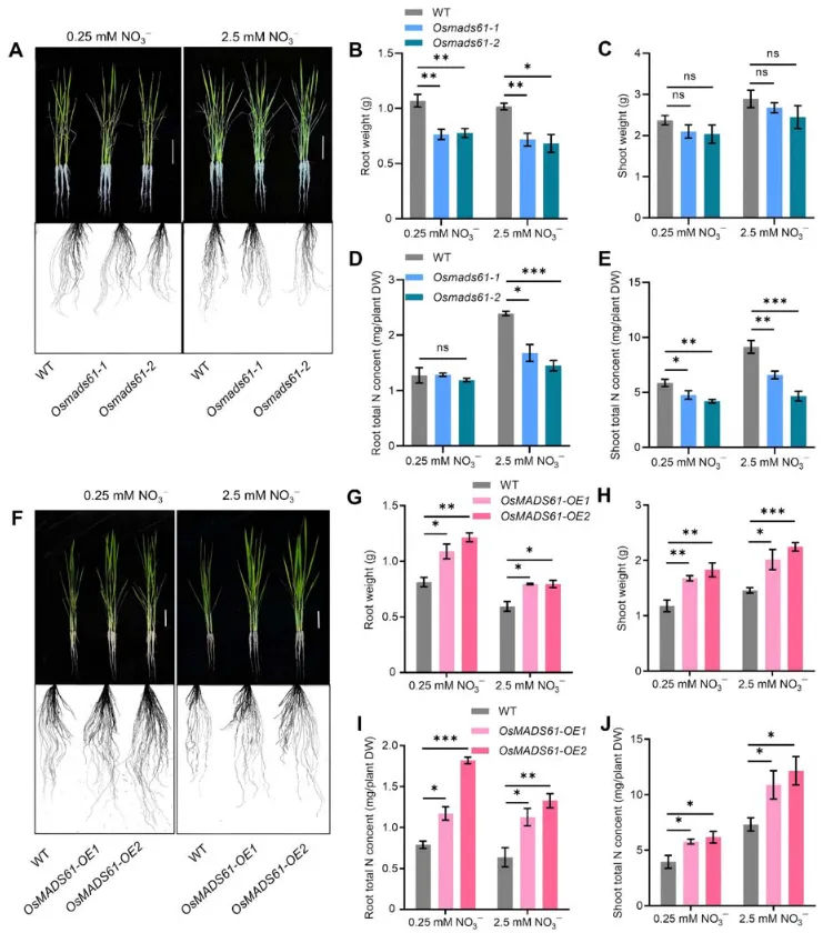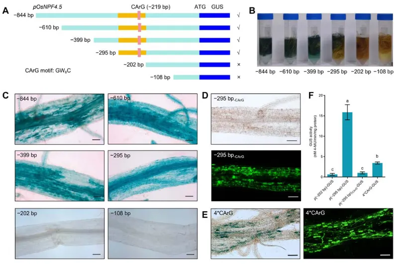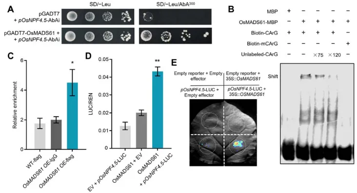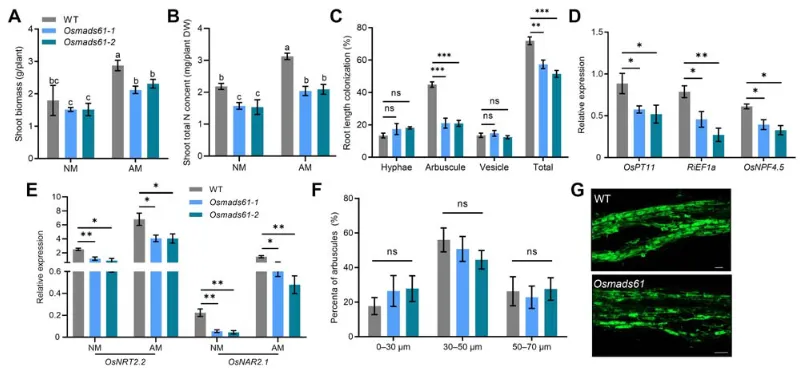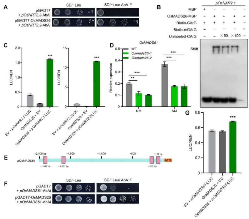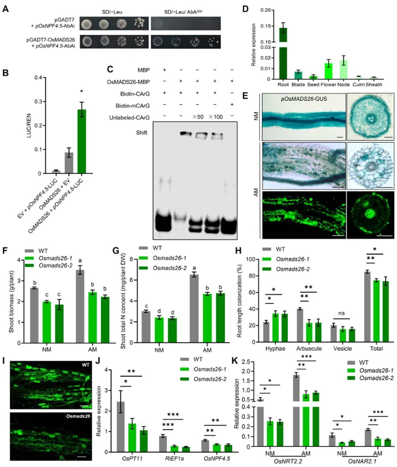 核心研究结果结果 1:CArG 与 GCC box 是 OsNPF4.5 在菌根根中激活的必需顺式元件。通过 OsNPF4.5 启动子截短与 GUS 报告系统,确定−295 至−202 bp 区域为菌根诱导表达核心区段。该区域含 MADS 结合基序 CArG(CW8G)与 GCC box,单独缺失任一基序均导致启动子活性几乎完全丧失;四串联 CArG 重复可驱动 GUS 在丛枝细胞特异性表达。EMSA 与原生质体转化证明,CCaMK–CYCLOPS 复合物通过 GCC box 正调控 OsNPF4.5 转录,明确双顺式元件协同激活机制。结果 2:OsMADS61 直接结合 CArG 基序正向调控 OsNPF4.5。从水稻 1588 个转录因子文库中,通过酵母单杂交筛选到 MADS 家族蛋白 OsMADS61。该基因受 AM 共生显著上调,定位于细胞核,在丛枝含体细胞中高表达。Y1H、EMSA、ChIP‑qPCR 与双荧光素酶实验一致证明,OsMADS61 通过 CArG 基序直接结合并激活 OsNPF4.5 启动子。敲除 OsMADS61 显著降低地上部生物量、氮积累量、菌根定殖率与丛枝丰度,同时下调 OsNPF4.5 表达,证实其正向调控菌根硝酸盐吸收。结果 3:OsMADS61 调控非共生条件下根系生长与直接硝酸盐吸收。OsMADS61 主要在根中表达,短期硝酸盐处理呈瞬时响应。敲除突变体根生物量下降约 30%、根长缩短,高 / 低硝酸盐条件下地上部氮积累均显著降低;过表达株系生物量与氮含量大幅提升。RNA‑seq 与 qPCR 显示,OsMADS61 正向调控直接吸收通路关键基因 OsNRT2.2、OsNAR2.1 及氮代谢、根系生长相关基因,并直接结合 OsNRT2.2 启动子激活表达,兼具调控根系发育与直接硝酸盐吸收功能。结果 4:OsMADS26 平行调控直接与菌根硝酸盐吸收通路。OsMADS26 同样受 AM 共生诱导,在丛枝细胞富集表达。Y1H、EMSA 与荧光素酶实验证明,OsMADS26 直接结合 OsNPF4.5、OsNRT2.2 与 OsNAR2.1 启动子并激活转录。敲除 OsMADS26 导致植株生长受抑、氮积累下降、菌根定殖与丛枝形成显著降低,靶基因表达下调,表型与 osmads61 相似,证明其独立调控双通路。结果 5:OsMADS26‑OsMADS61 形成层级调控模块。osmads26/61 双突变体较单突呈现更显著的生长、氮积累与菌根定殖缺陷,OsNPF4.5 表达进一步下调。osmads26 突变体中 OsMADS61 表达显著下降;Y1H 与荧光素酶实验证实 OsMADS26 直接结合 OsMADS61 启动子并激活转录,形成OsMADS26→OsMADS61层级调控,协同放大对双硝酸盐吸收通路的调控效应。