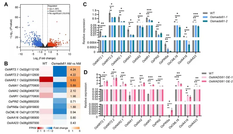 图文解析图 1:OsNPF4.5 不同启动子截短体在菌根根的 GUS 活性,证明−295 bp 片段足够驱动表达,CArG 缺失使活性丧失,4×CArG 可恢复表达,明确 CArG 为核心元件。图 2:OsMADS61 通过 Y1H、EMSA、ChIP‑qPCR 与荧光素酶实验,直接结合并激活 OsNPF4.5 启动子,结合依赖 CArG 基序。图 3:OsMADS61 组织表达以根为主,受 AM 共生诱导在丛枝细胞特异性增强,硝酸盐短期处理呈动态响应。图 4:osmads61 突变体菌根条件下生物量、氮含量、菌根定殖率下降,OsNPF4.5 等靶基因表达下调,表型与 OsNPF4.5 突变体相似。图 5:OsMADS61 敲除降低根生物量与氮积累,过表达显著提升生长与氮含量,调控直接硝酸盐吸收与根系生长。图 6:osmads61 根 RNA‑seq 鉴定到氮转运、代谢及根系发育相关基因下调,qPCR 验证表达趋势。图 7:OsMADS26 结合并激活 OsNPF4.5,在根与丛枝细胞特异表达,敲除导致生长、氮积累与菌根定殖缺陷。图 8:OsMADS26 直接结合 OsNRT2.2、OsNAR2.1 与 OsMADS61 启动子并激活转录,构建层级调控。图 9:工作模型,OsMADS26 与 OsMADS61 通过 CArG 调控 OsNPF4.5(菌根通路)及 OsNRT2.2/OsNAR2.1(直接通路),OsMADS26 上游调控 OsMADS61,CCaMK‑CYCLOPS 通过 GCC box 协同激活 OsNPF4.5。