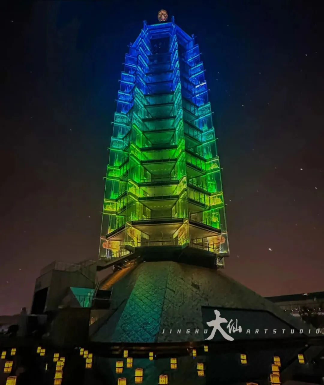 这座九层八面的巨塔高达 78.2 米,通体由白、黄、绿、红、黑五色琉璃砖砌成,每一块砖上都雕有佛像、飞天、瑞兽,工艺登峰造极。塔顶黄金为顶,塔身悬挂 146 盏长明灯,昼夜通明,被誉为 “中国之大古董,永乐之大窑器”。
