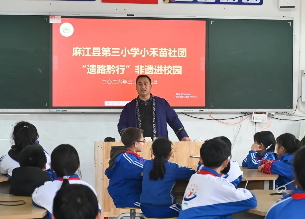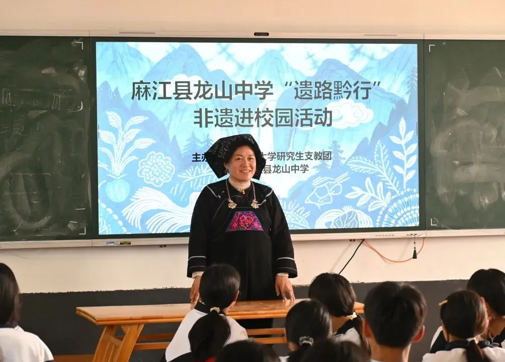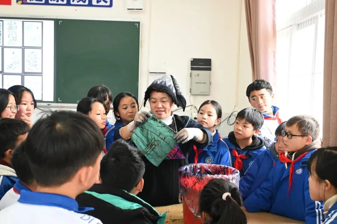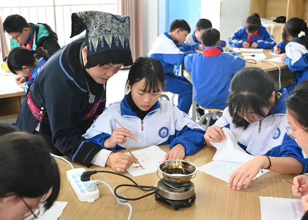 为将本土文化、民间艺术与非遗技艺有机融入教学全过程,推动五育融合,弘扬麻江优秀传统文化,增强青少年对中华优秀传统文化的认同感与自豪感,3月27日至31日,南京农业大学第27届研究生支教团先后走进贵州省麻江县第三小学与龙山中学,开展“遗路黔行”主题系列活动第一期——“一抹枫香,一脉染艺”非遗文化进校园。活动荣幸邀请到州级非物质文化遗产传承人、龙山镇河坝村委会主任龙全成和县级非物质文化遗产传承人曹顶秀走进校园,带领两校共90余名学生近距离感受这项国家级非物质文化遗产的独特魅力。