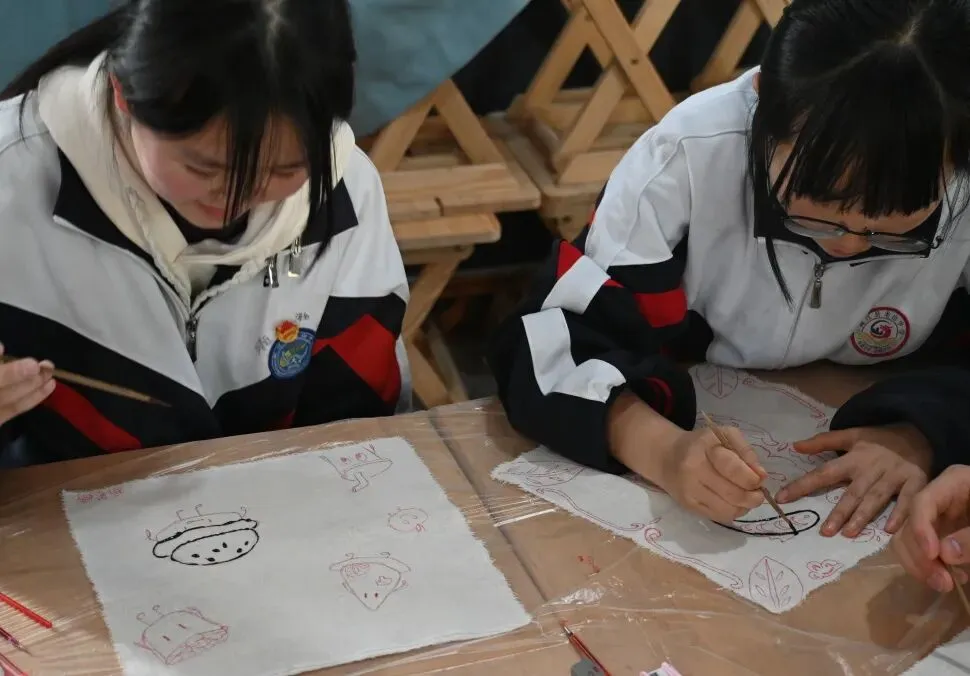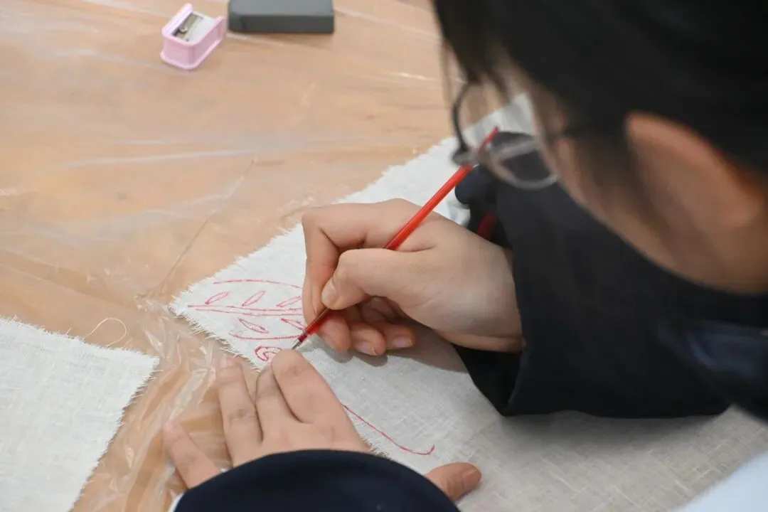 在传承人和研支团志愿者的指导下,同学们从临摹图案开始,用竹签蘸取温热的枫香油,在布面上一笔一划地绘制属于自己的作品。在图案旁写下自己的名字,用童真为传统技艺注入趣味;以细腻的笔触,将个人创意与传统纹样相结合。蜡痕在温热的枫香油中逐渐成形,同学们在这一过程中真切感受到了匠心与创造力的交融。