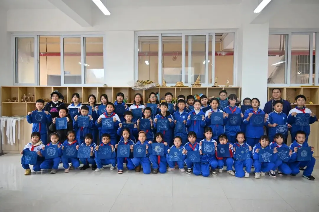 当布匹从染缸中取出,由绿色缓缓氧化为蓝色时,两校活动现场都发出阵阵惊叹。同学们亲眼见证着色彩在布料上“苏醒”的奇妙过程,课堂气氛热烈而专注。最后的脱蜡环节,大家小心翼翼地将自己的作品放入水中,随着枫香油缓缓溶解,一幅幅蓝白相间、独具匠心的枫香染手帕跃然眼前。每一件作品都承载着同学们的巧思与对传统文化的理解,大家在合影留念时笑意盈盈,为此次非遗体验画上了圆满的句号。