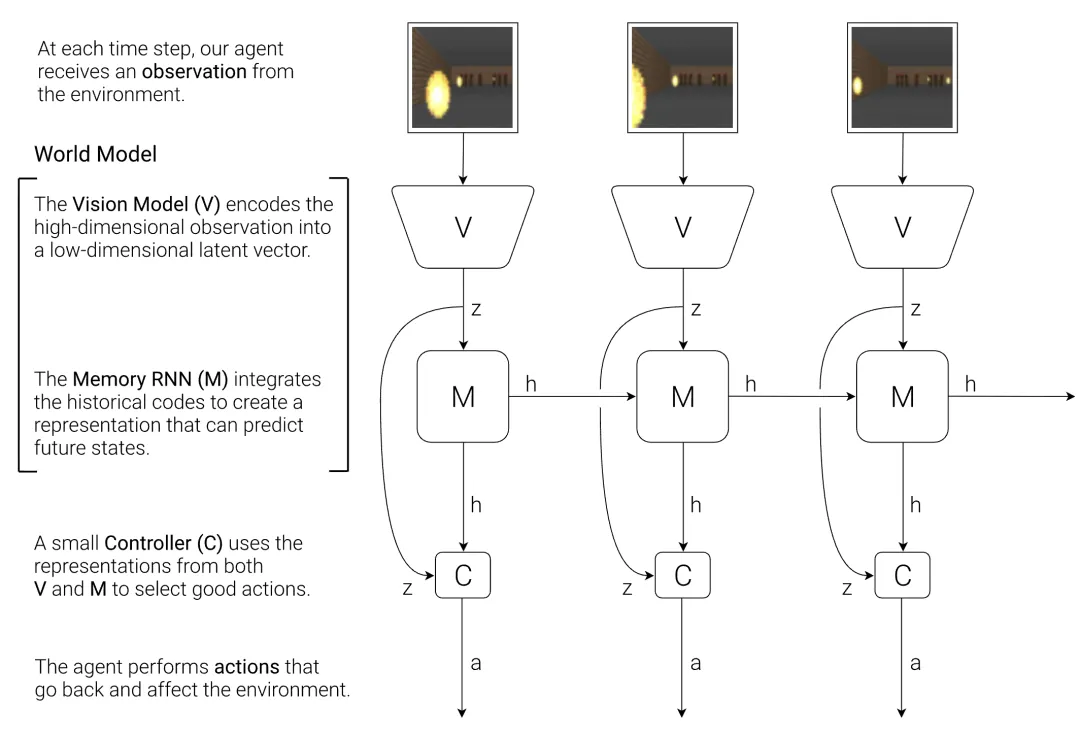 经典论文《World Models》奠定了这一方向的基本框架。一个完整的世界模型通常包含两个核心部分,如图 1: