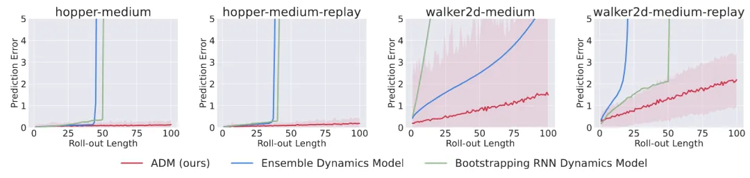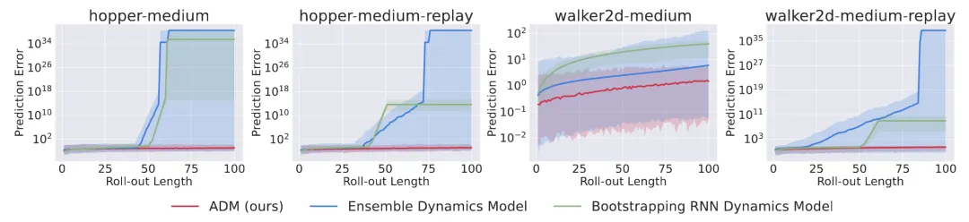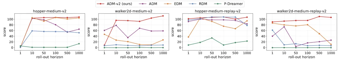 ADM-v2 的关键突破就在于:在离线强化学习的动力学模型设定下,它首次将 full-horizon roll-out 稳定推进到上千步规模。