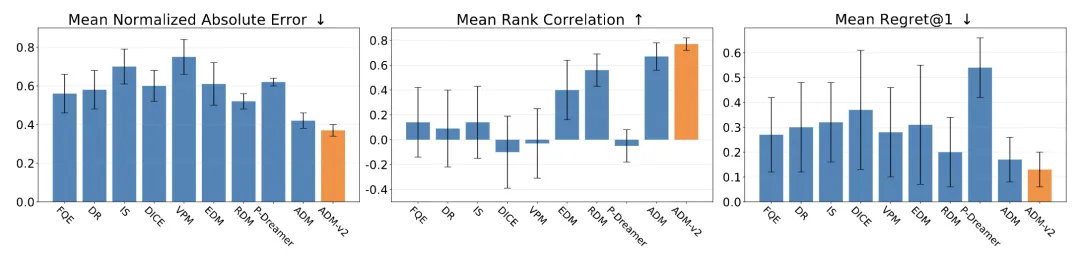 ADM-v2 在这方面取得了明显进展。论文在 DOPE benchmark 上的结果表明,基于 ADM-v2 的完整时域滚动推演评估优于多种离线策略评估方法,也优于其他动力学模型方案。