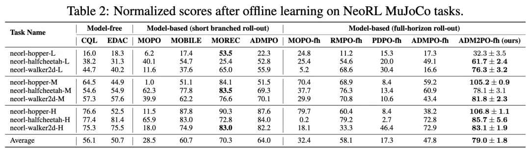 论文报告,基于 ADM-v2 的 ADM2PO-fh 在 D4RL 和 NeoRL 上取得了新的最好结果;与此前强基线相比,平均性能提升分别超过 4.6% 和 12.8%。
