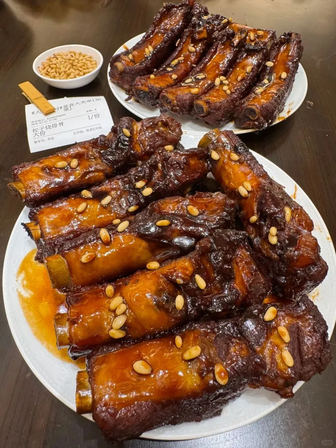 松子烧排骨也是很多人桌上的必点菜,带着脆骨的肉炖得很软烂,甜口刚好一点都不腻,配上表面的松子越嚼越香。