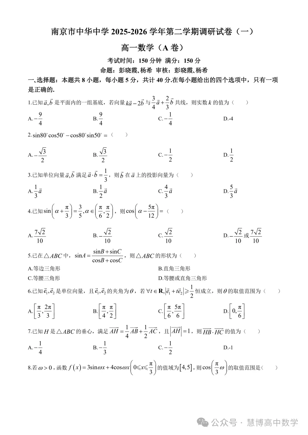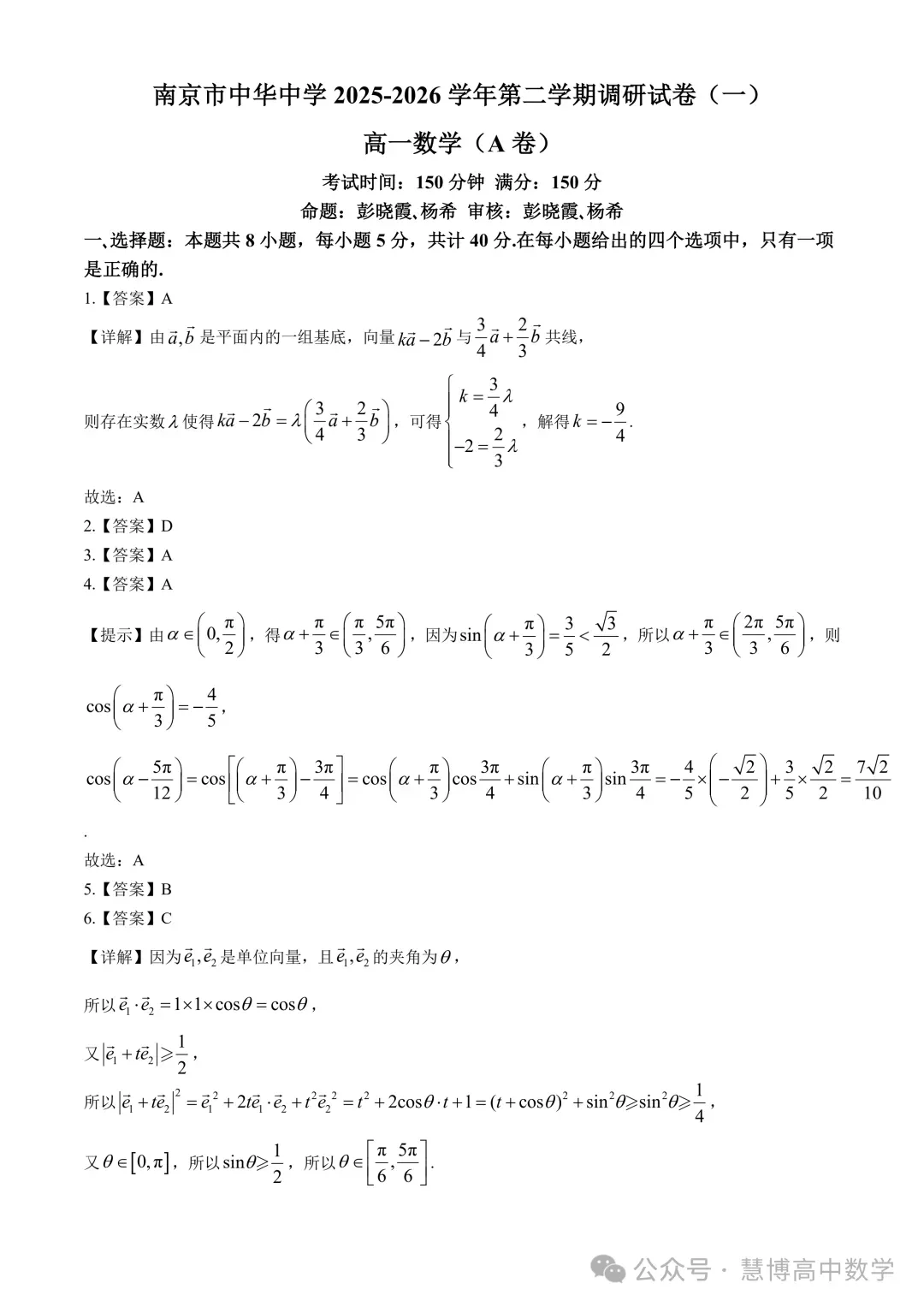 江苏南京市中华中学2025-2026学年高一下学期调研试卷(一)数学试题+答案